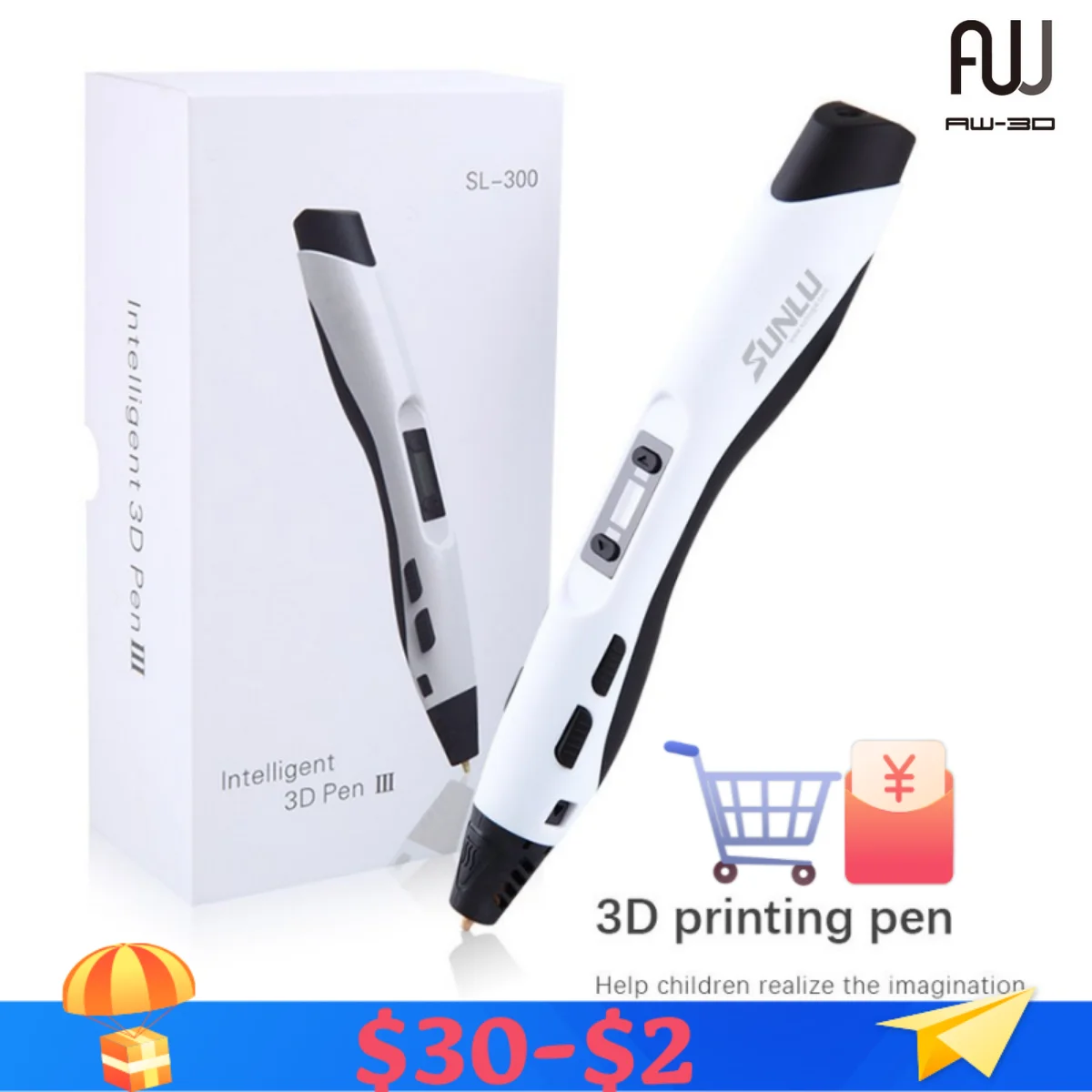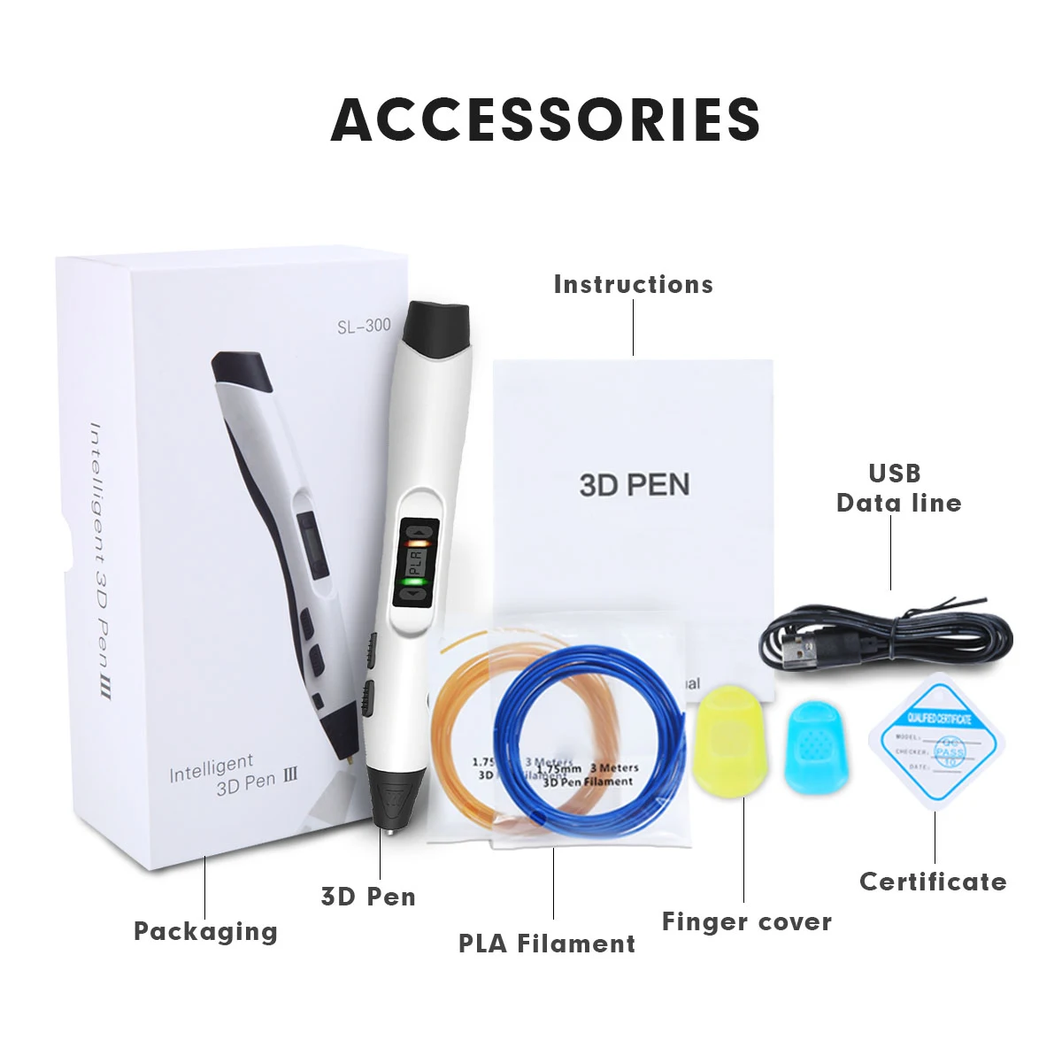 Название: SL-300Количество:1 ручка,1x адаптер,1 основание ручки,1 руководство пользователя,2x PLA нить,2x Крышка для пальцевОптимальная температура: АБС 180-210 ℃PLA 160-180 ℃Применимый материал: 1,75 мм PLA/ABSЦвет: белый/черный/синий/зеленыйВходная мощность: DC5V 2A 10WМощность вход адаптера переменного тока: AC100-240V 50/60HZ 0.35A