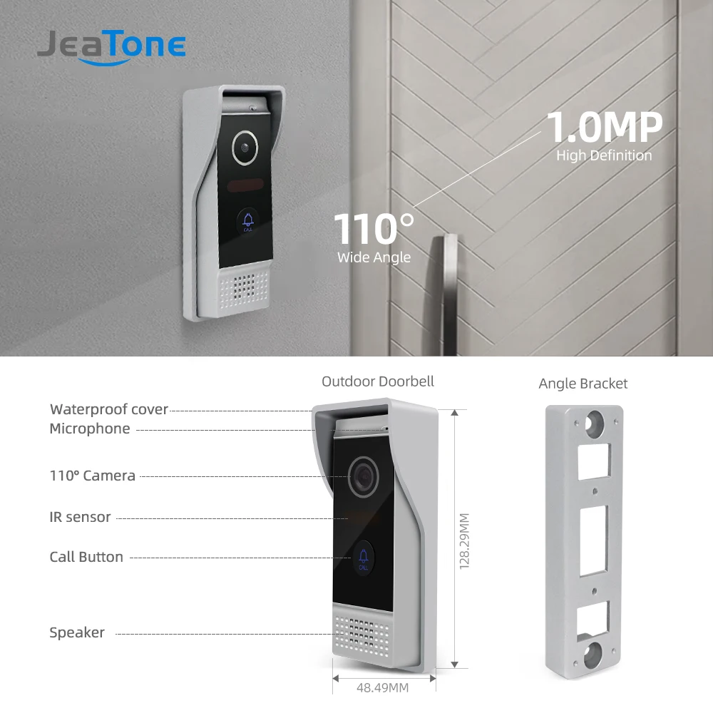 Проводной видеодомофон JEATONE, 720P, наружная камера, Водонепроницаемый дверной звонок с широким обзором