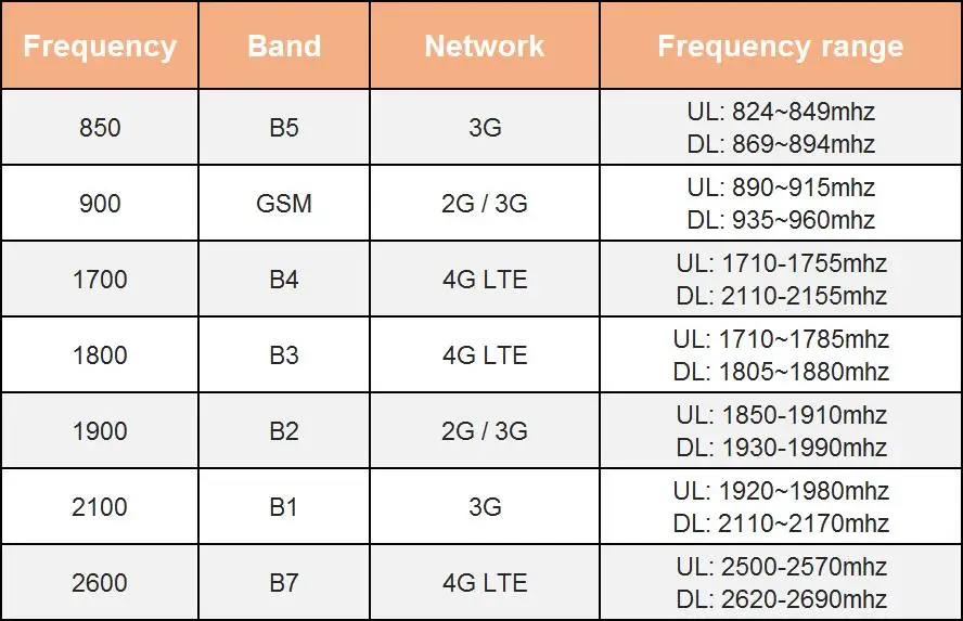 Диапазон частот:Канал связи: 824-849 МГц/1850-1910 МГц/1710-1755 МГцНисходящее звено: 869-894 МГц/1930-1990 МГц/2110-2155 МГц