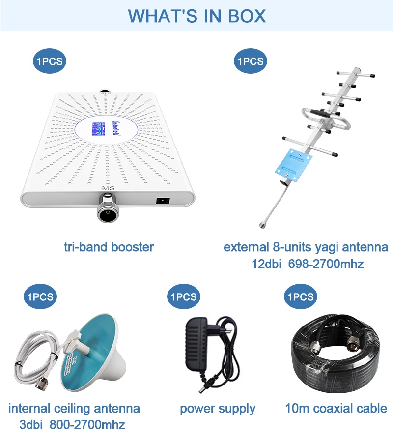 1. Усилитель сигнала 2G 3G 4G2. Шнур питания переменного тока и руководство по эксплуатации3. Внешний 8 единиц yagi антенна4. Внутренняя потолочная антенна5. 10 м кабель
