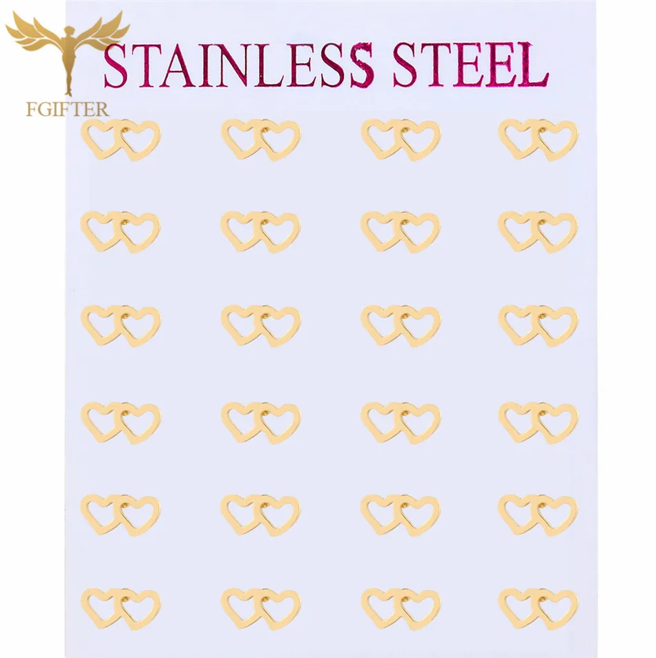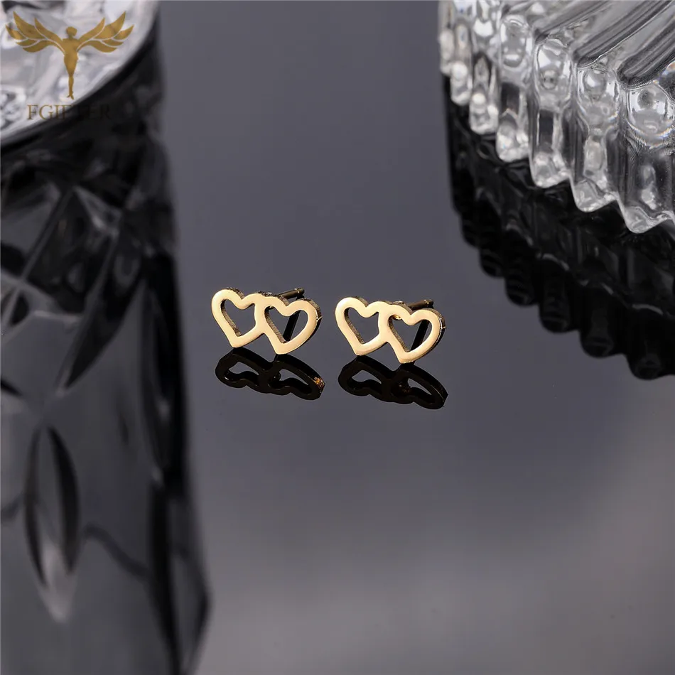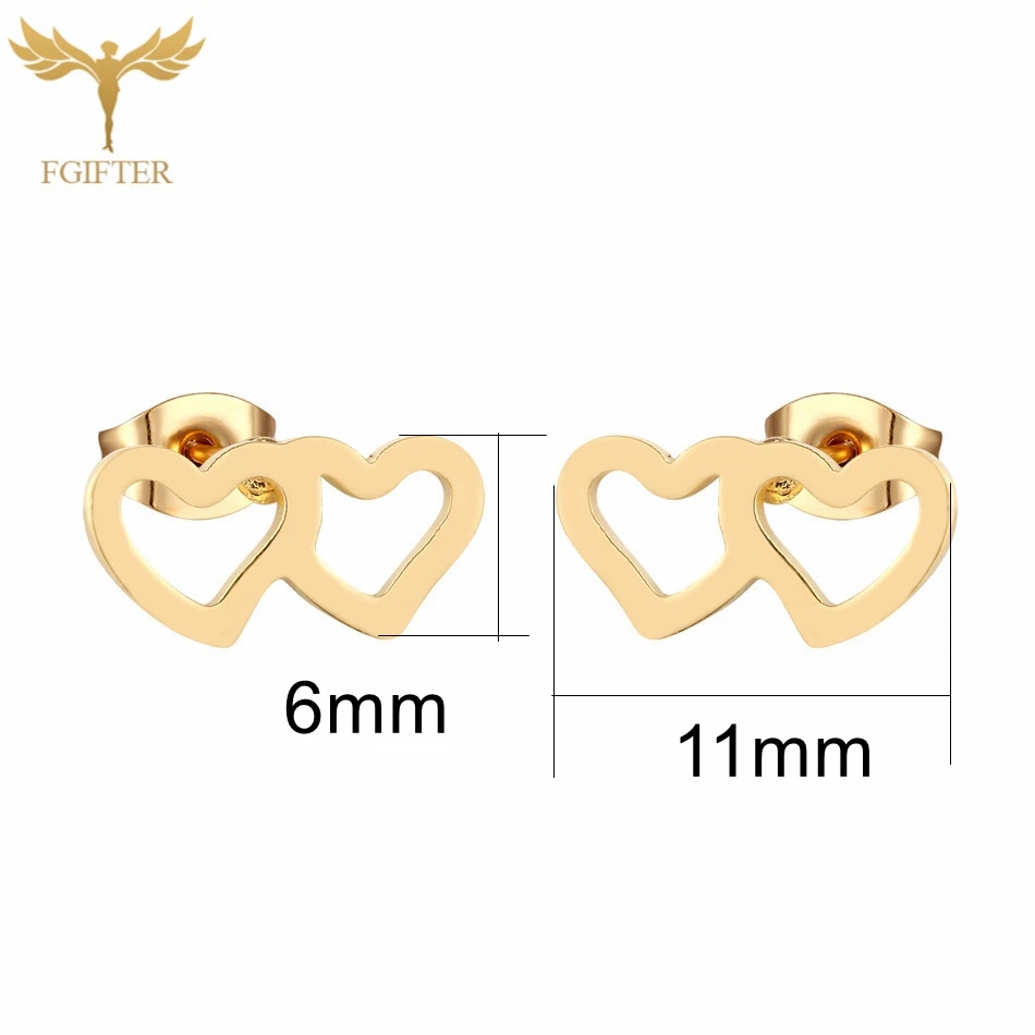 Женские серьги-гвоздики из нержавеющей стали, с двумя сердечками