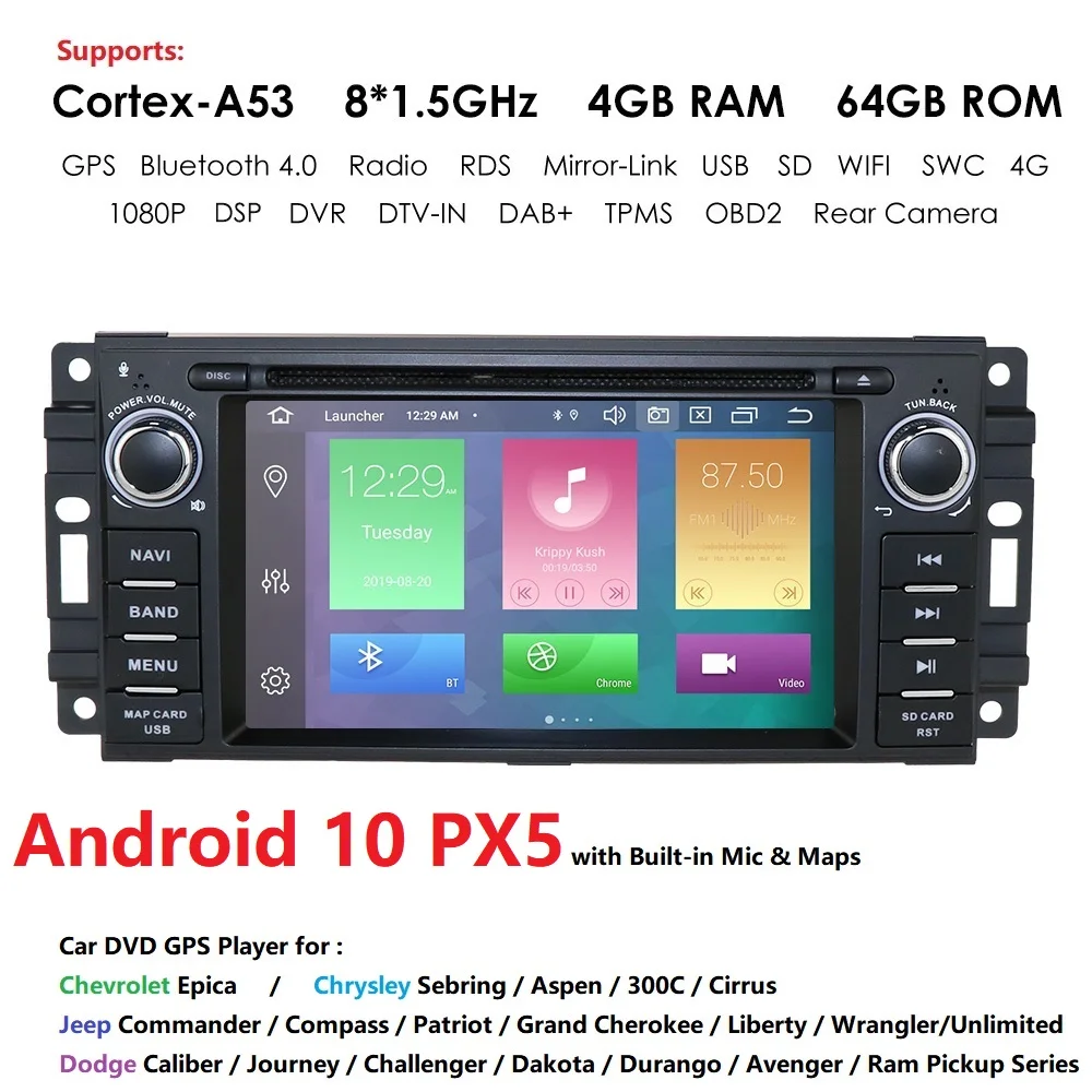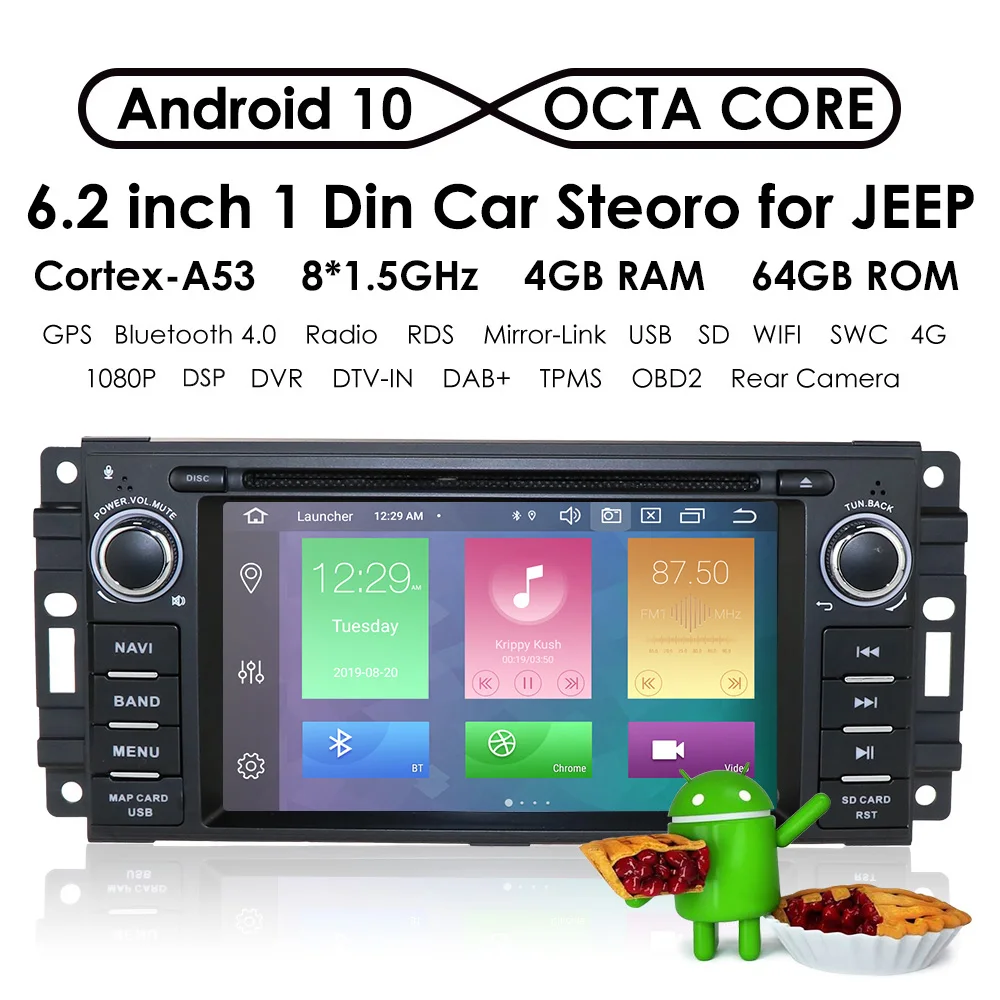 Автомагнитола Wrangler для Dodge Challenger, стерео-проигрыватель 1 Din с Android 10 для Jeep Cherokee 2009 2008 2010, 4 Гб ОЗУ, 64 Гб ПЗУ
