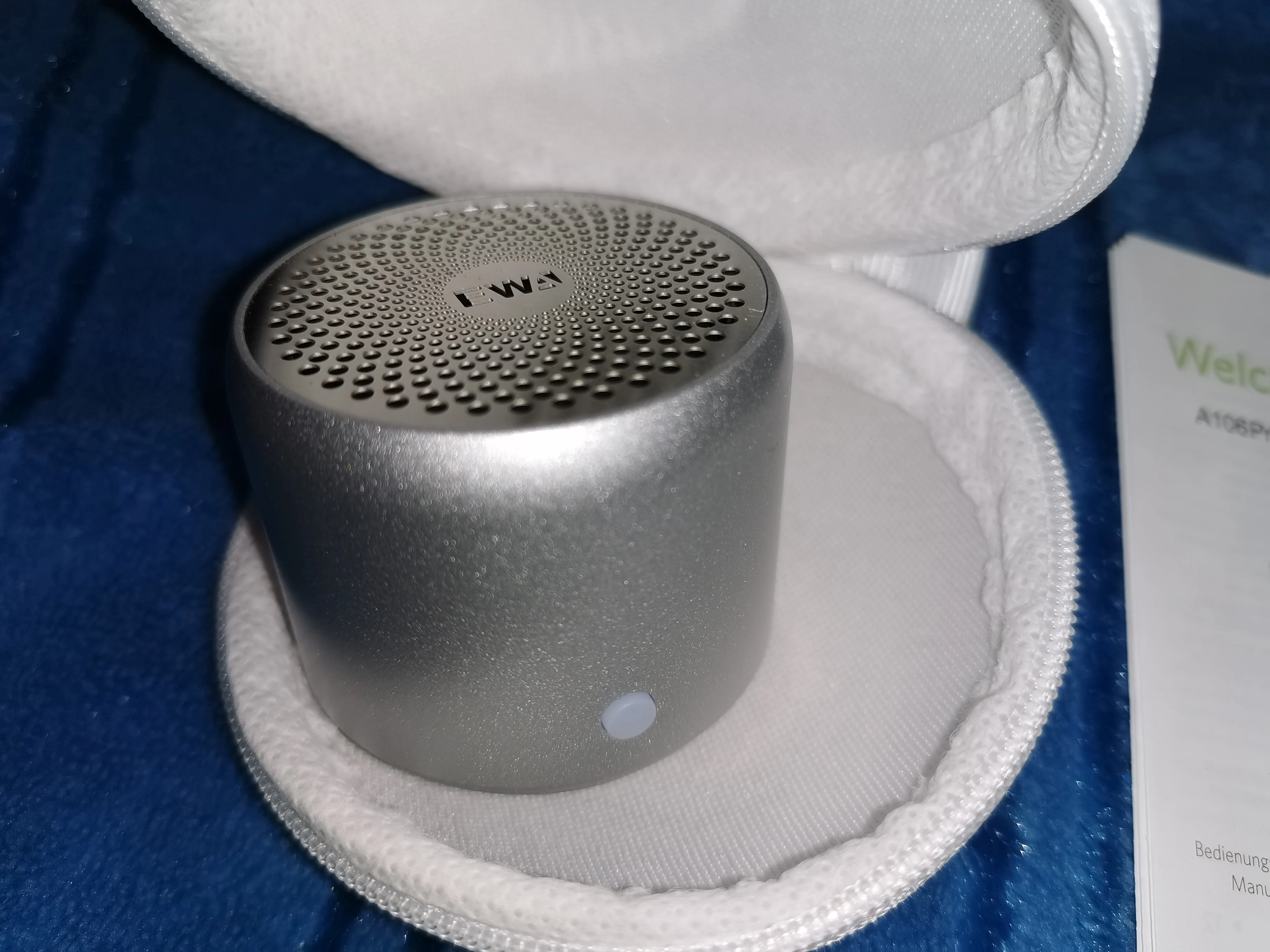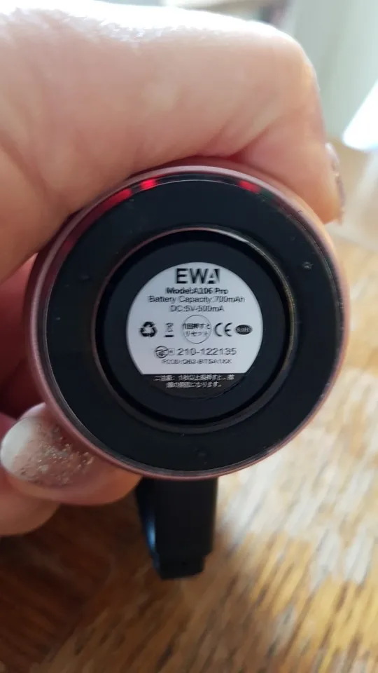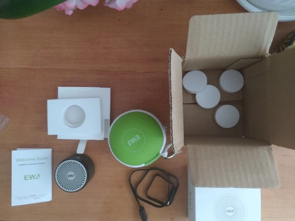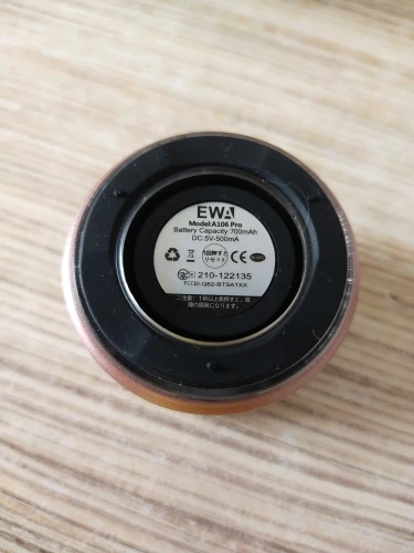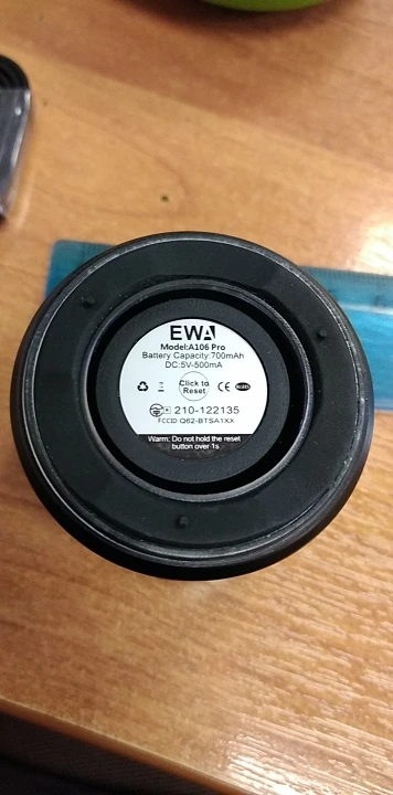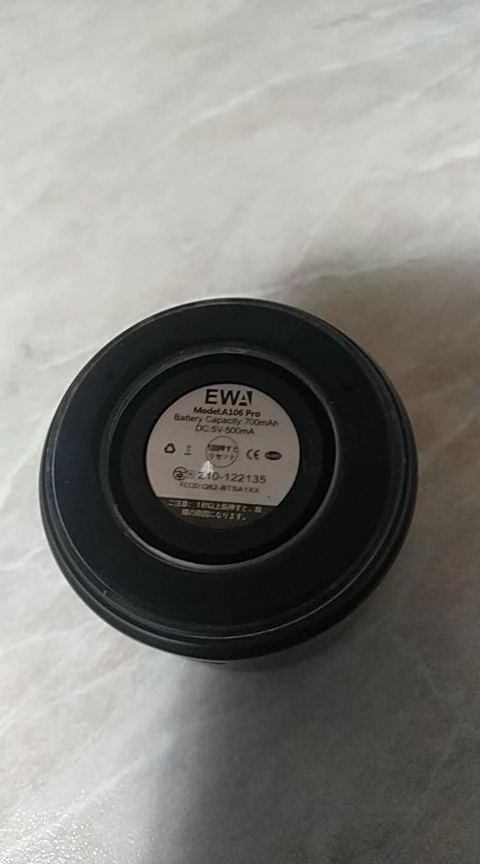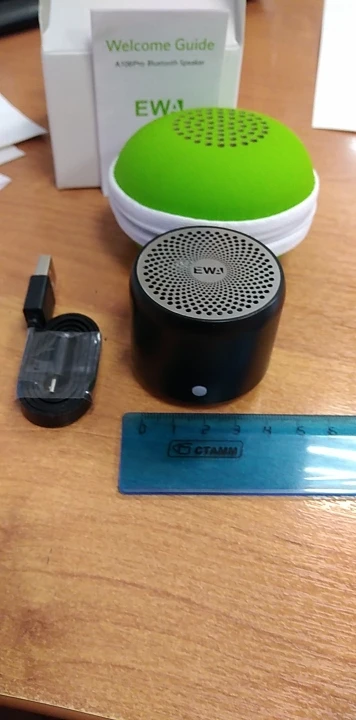 Беспроводная колонка EWA A106Pro пришла за 4 дня с российского склада, включая день заказа. Продавец отлично упаковал товар. Плотная коробка, внутри еще одна фирменная коробка EWA, обмотанная мягким утеплителем. Пришло в идеальном состоянии. В комплекте: 1. Беспроводная колонка EWA A106Pro 2. Мягкий круглый чехол сумка с молнией для хранения колонки 3. Кольцо для сумки 4. USB Micro кабель плоский 5. Инструкция на английском языке Включение колонки простое. Удерживаем кнопку на колонке 2 секунды и загорается на кнопке синий индикатор подсветка. На телефоне включаем Bluetooth и видим EWA A106Pro и нажимаем Сопряжение. Эта кнопка единственная на колонке. Она же выполняет функцию включения и остановки проигрывания музыки. Колонка из настоящего металла, вес чувствуется, грамм 200-300. Внизу колонки встроен бассовый динамик. Бассов и громкости 3 Вт вполне хватает для такого размера колонки. Продавец предоставил хорошую скидку. Рекомендую покупать у этого продавца.