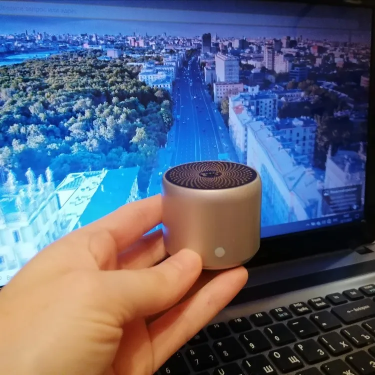Маленькая, лёгкая. Заказала в ночь на 27 февраля, 1 марта курьер доставил в квартиру. Даже не ожидала такую быструю доставку, пришлось просить соседей встретить курьера. Звук хороший, громкий. Кухонные весы показывают, что весит 175 грамм. На фото для понимания размеров спичечный коробок рядом с колонкой. Весь вечер играет, пока все ок. Взяла из-за маленького размера, чтобы брать в поездки, но кажется и дома вполне неплохо слушать. Покупкой довольна, с продавцом общаться необходимости не было