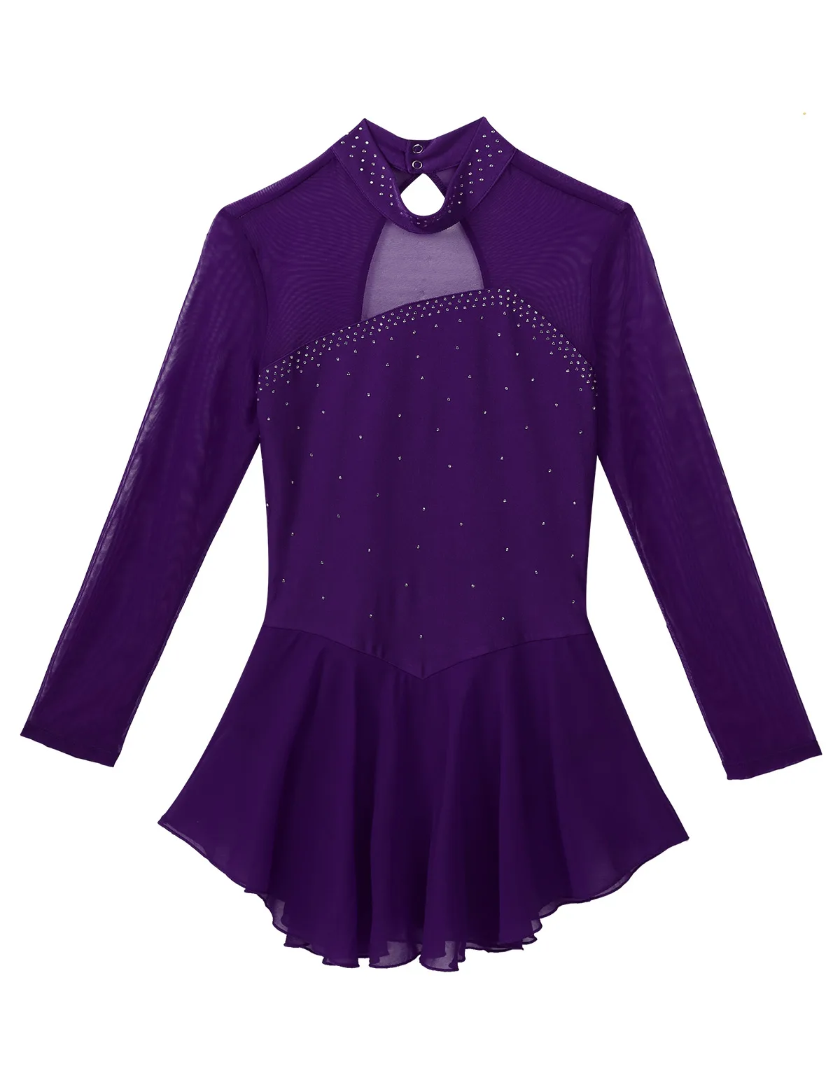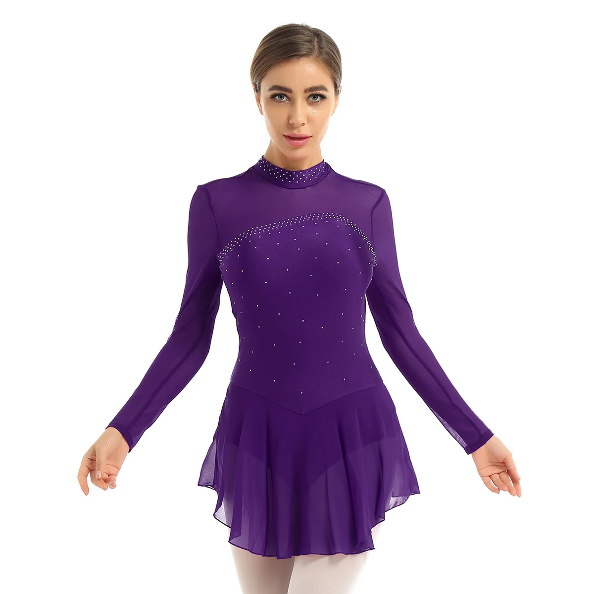 Женское платье для фигурного катания, блестящие стразы с длинными рукавами и вырезом-капелькой на спине, костюм для трико для балета и танцев