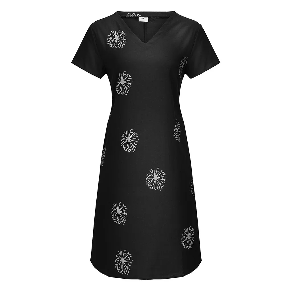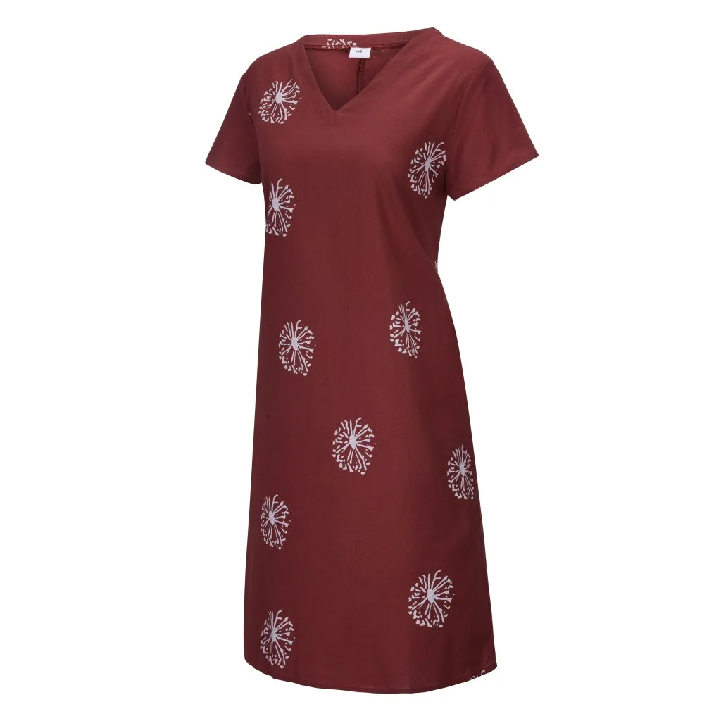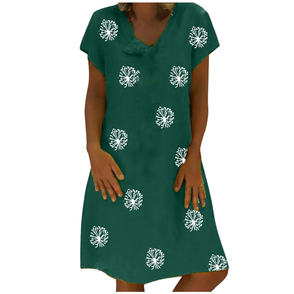 Женское платье из хлопка и льна #35, повседневное свободное платье мини с цветочным принтом и V-образным вырезом, с коротким рукавом, размера плюс