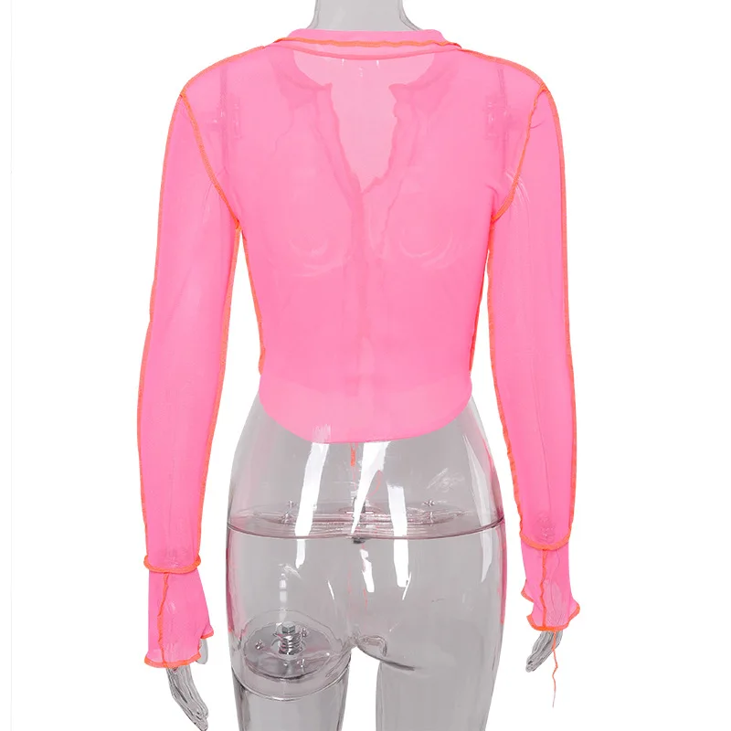 Женская Прозрачная Футболка shstyle, розовая сетчатая укороченная футболка с длинным рукавом и v-образным вырезом, в стиле пэчворк, неоновый клубный Топ, 2020