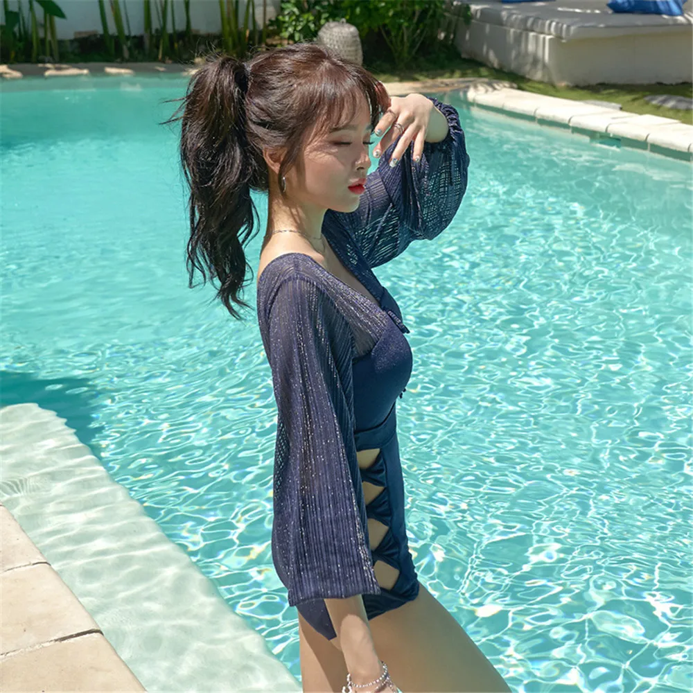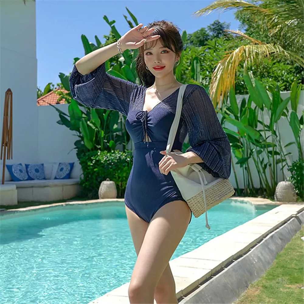 Женский слитный купальник с длинным рукавом, однотонный кружевной монокини с пуш-ап, корейский купальник с открытой спиной, купальник синего цвета