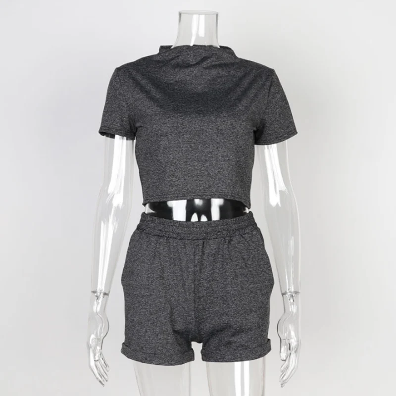Женский комплект для фитнеса из двух предметов, однотонный короткий топ с круглым вырезом и коротким рукавом + шорты с высокой талией