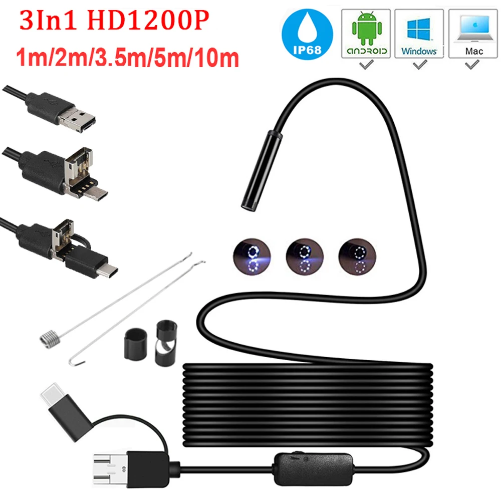 3 в 1 USB эндоскоп жесткиймягкий кабель 1200P бороскоп Инспекционна...
