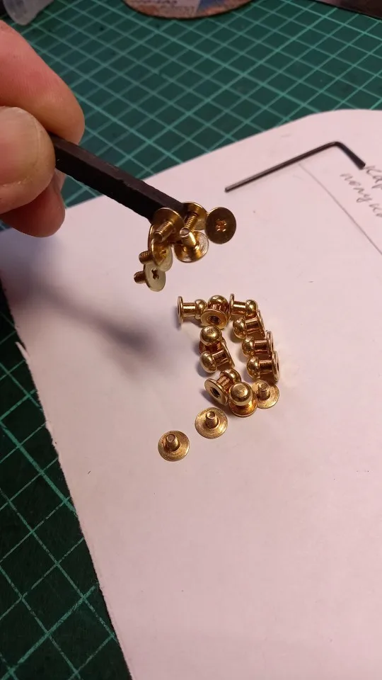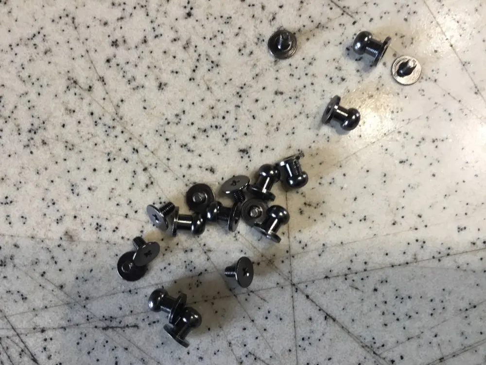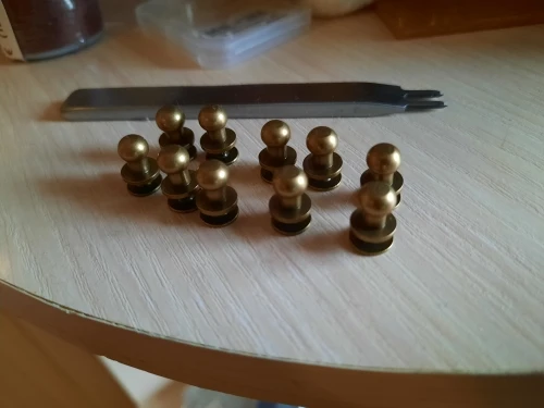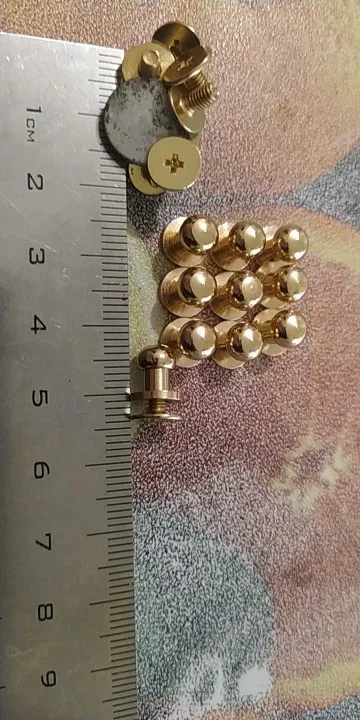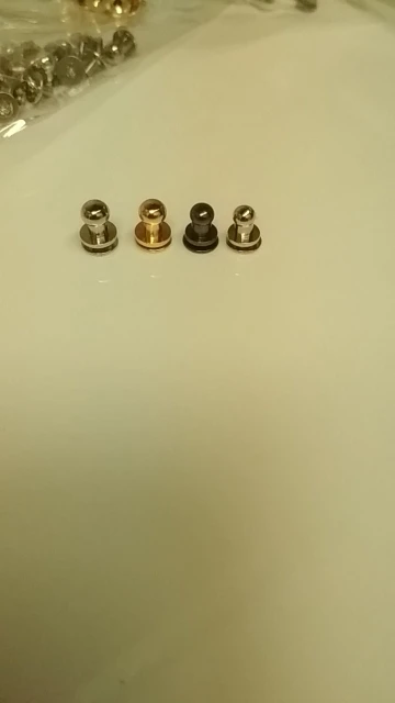 Хорошие кнопки. Винты магнитные, сама кнопка нет. Те что взял - на толщину кожи 3 мм. Кнопка лëгкая. Из интереса царапал поверхность ножом - стойкая, когда потëр на на камне, то под желтым покрытием показался белый металл, вероятно алюминий. Резьба винтов и кнопок совпадает, винт закручивается полностью, под шляпку, если на 1-1, 5 витка, то на толщину 3. Хорошая кнопка.