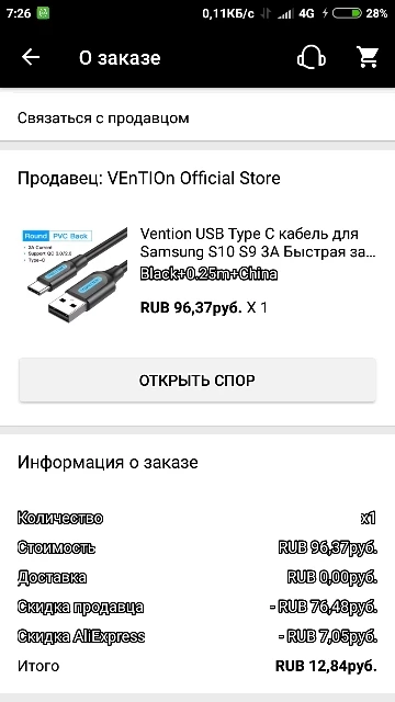 Заказал 2020.11.12 за 108,53 руб. - купон продавца 79,22 руб. Отправлено 2020.11.18. Доставлено 2020.11.26. Кабель выглядит добротно. Быстрая зарядка идет (а моем телефоне это 6,36 В при токе 1,9 А).