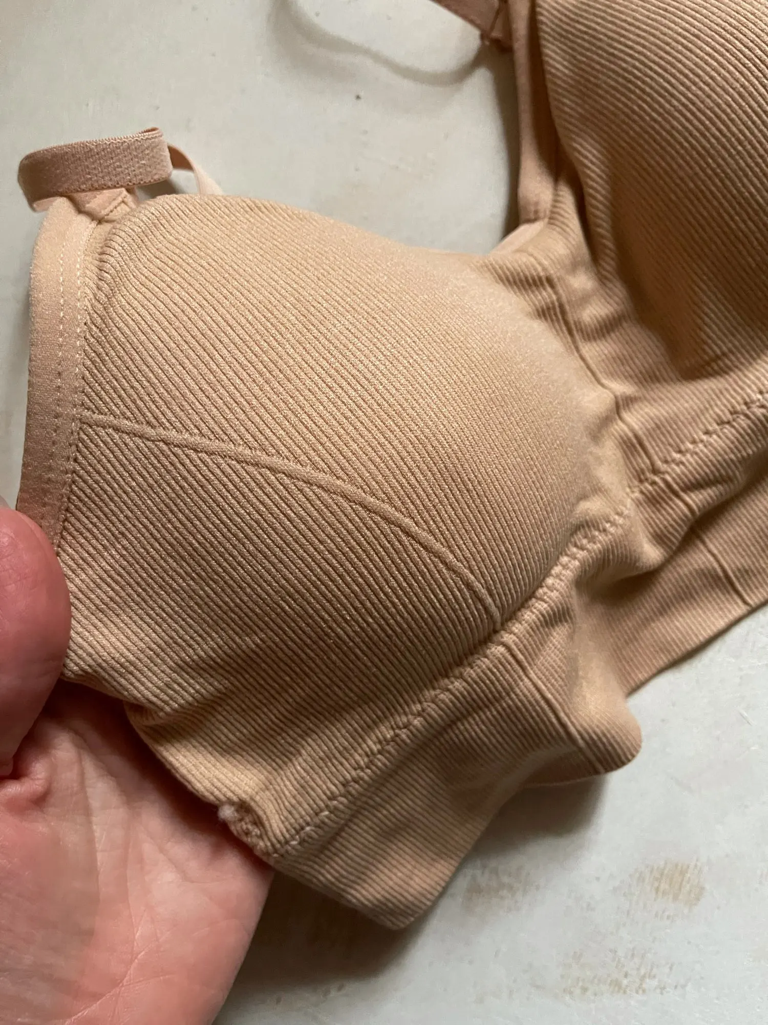 Качество на первый взгляд хорошее. Посмотрим, как будет после носки и стирки. Обратите внимание, что в чёрном цвете такая модель будет из более плотной, качественной ткани. Бежевый более мягкий. Надеюсь не растянется. Чашки неудобные, но их можно заменить. На ОГ 86 сел хорошо. Трек отслеживался, дошёл за две недели. Продавца рекомендую.