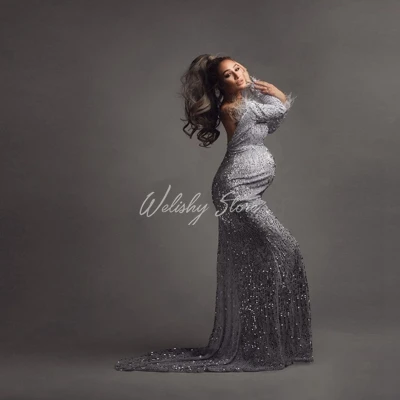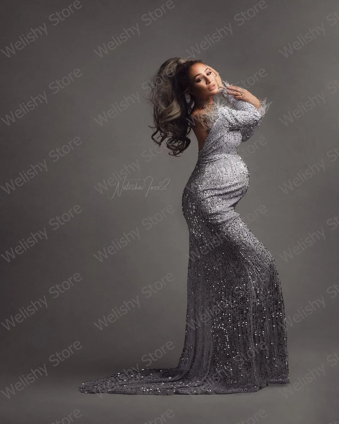 Великолепные блестящие серебристые женские вечерние платья с открытой спиной для беременных 2021 модные блестящие Длинные рукава с перьями