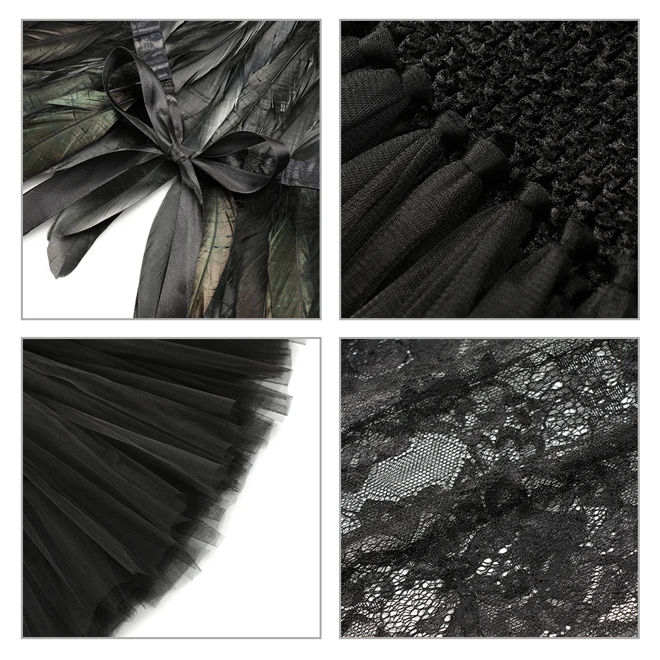 Платье смотрится хорошо, на девочку 7 лет заказала 8-9 размер. Село отлично. Оно тянется. Под него лучше надеть чёрную футболку и чёрные колготки. Обруч классный, крылья сыпятся, не страшно, можно при желании подклеить. Низ платья не целиковый, а из кусков ткани, поэтому тоже лучше юбку под низ.