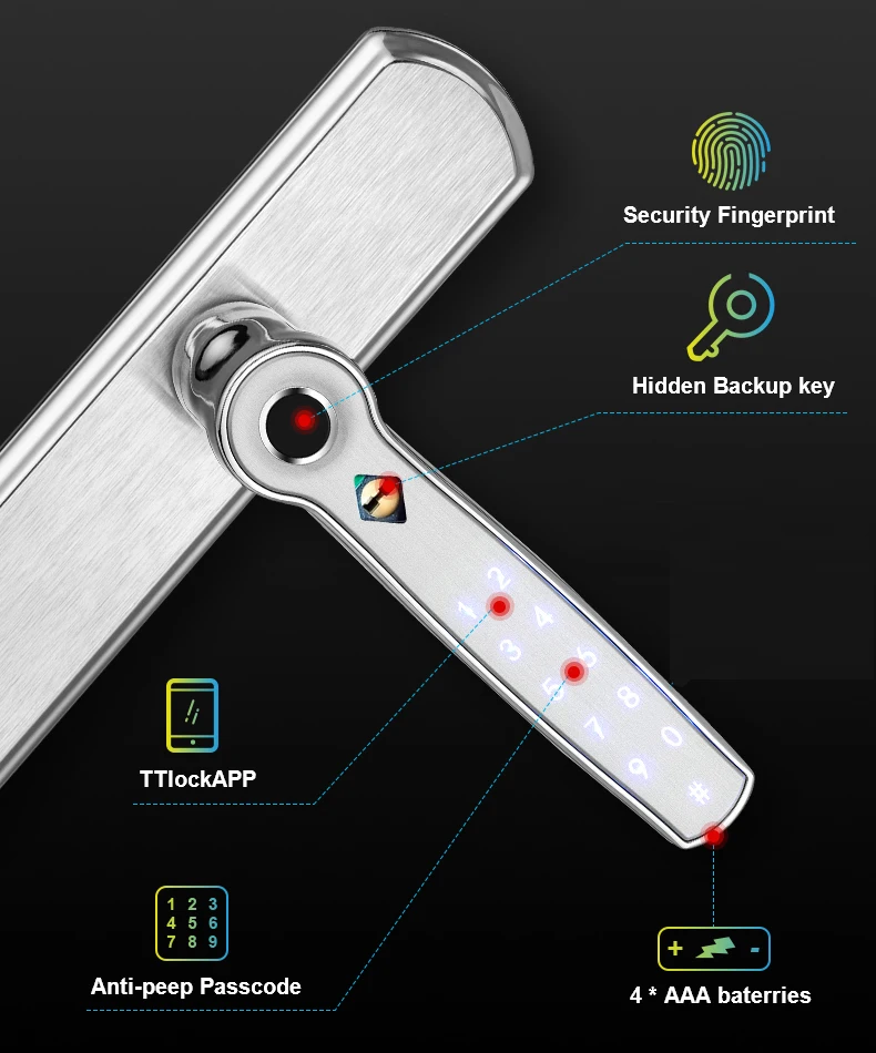 1. Bluetooth, поддержка приложения TT lock; 2. Телефон приложение/отпечаток пальца/Пароль/механический ключ разблокировки; 3. Управляйте блокировкой с помощью приложения для телефона; 4. Добавить Шлюз может подключаться к Wifi, управлять блокировкой удаленно; 5. После добавления шлюза, может работать с Alexa и Google Assistant; 6. Много размеров врезного замка на выбор.