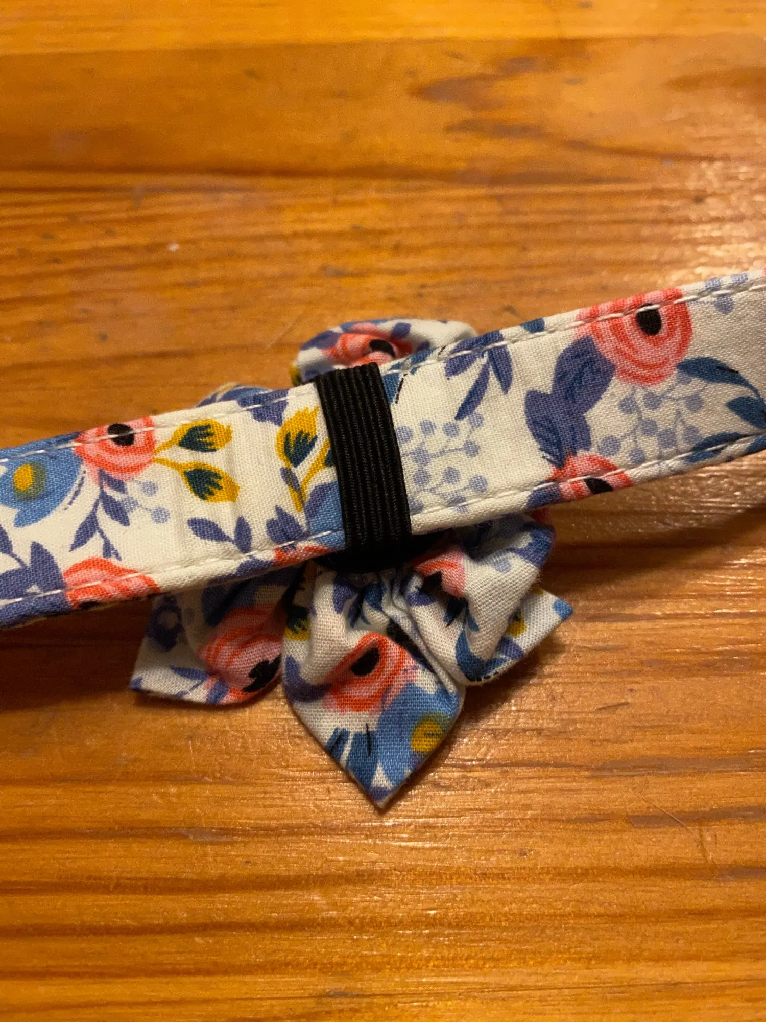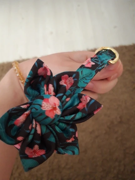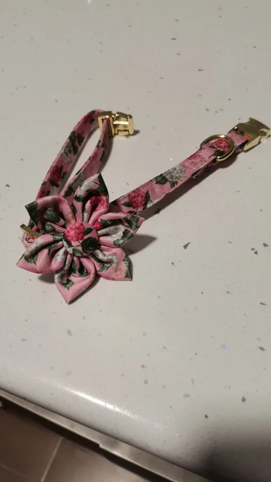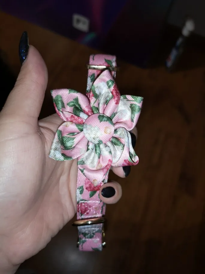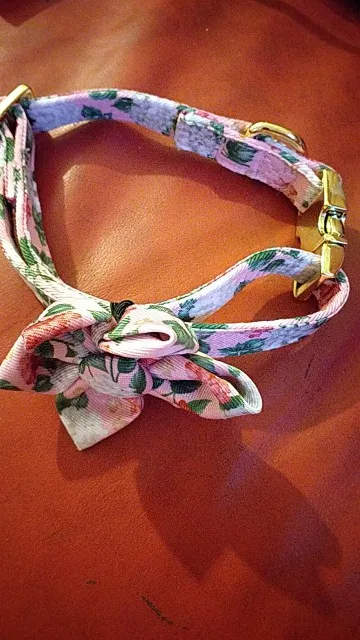 Хороший ошейник. Надпись напечатана правильно. регулировка длинны не съезжает. Застежка кажется кличкой, не смотря на материал, очень тяжело растягивается. Бантик на резинки, если что можно снять, немного помялся в поездке, но легко исправить утюгом.