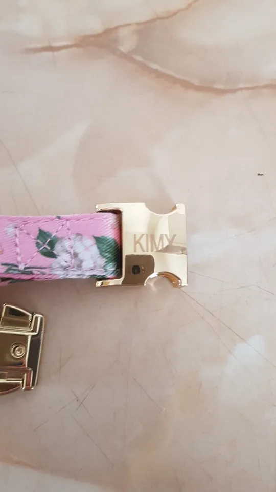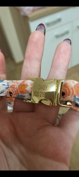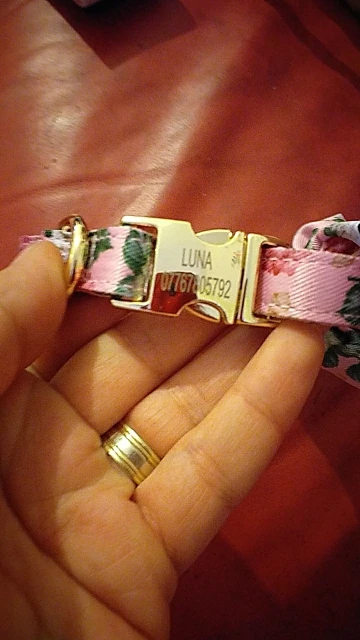 Ошейник из ткани, фурнитура золотая тяжелая, для разнообразия и купили.Продавец сделал гравировку, без ошибок