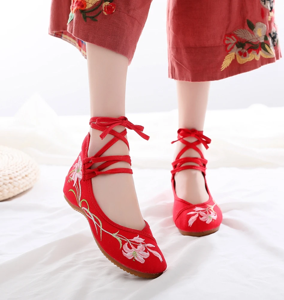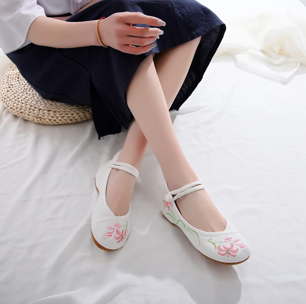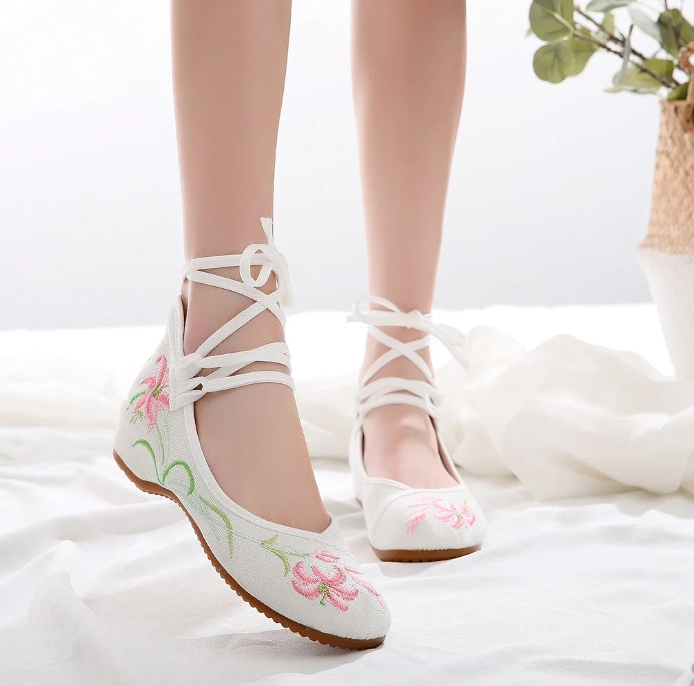Женские холщовые балетки Veowalk с цветочной вышивкой, балетки с длинным ремешком на щиколотке, повседневная обувь на плоской подошве, женские прогулочные туфли