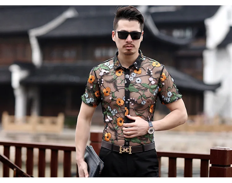 Мужская прозрачная рубашка с цветочным кружевом, прозрачная сетчатая рубашка с вышивкой, летняя рубашка с короткими рукавами