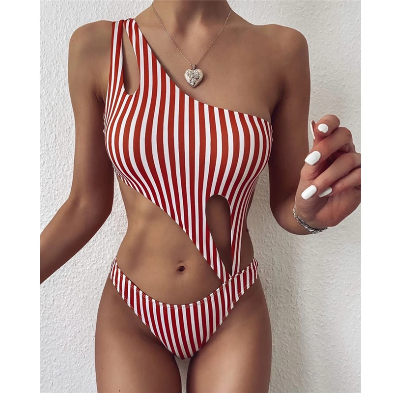 2022 пикантный Цельный купальник, купальный костюм с лямкой на шее, на одно плечо, Классический Полосатый Женский комплект