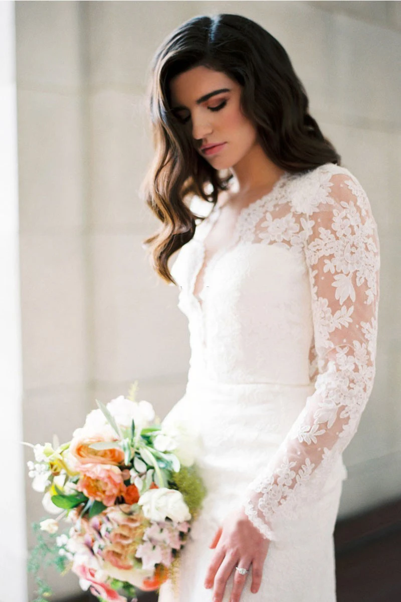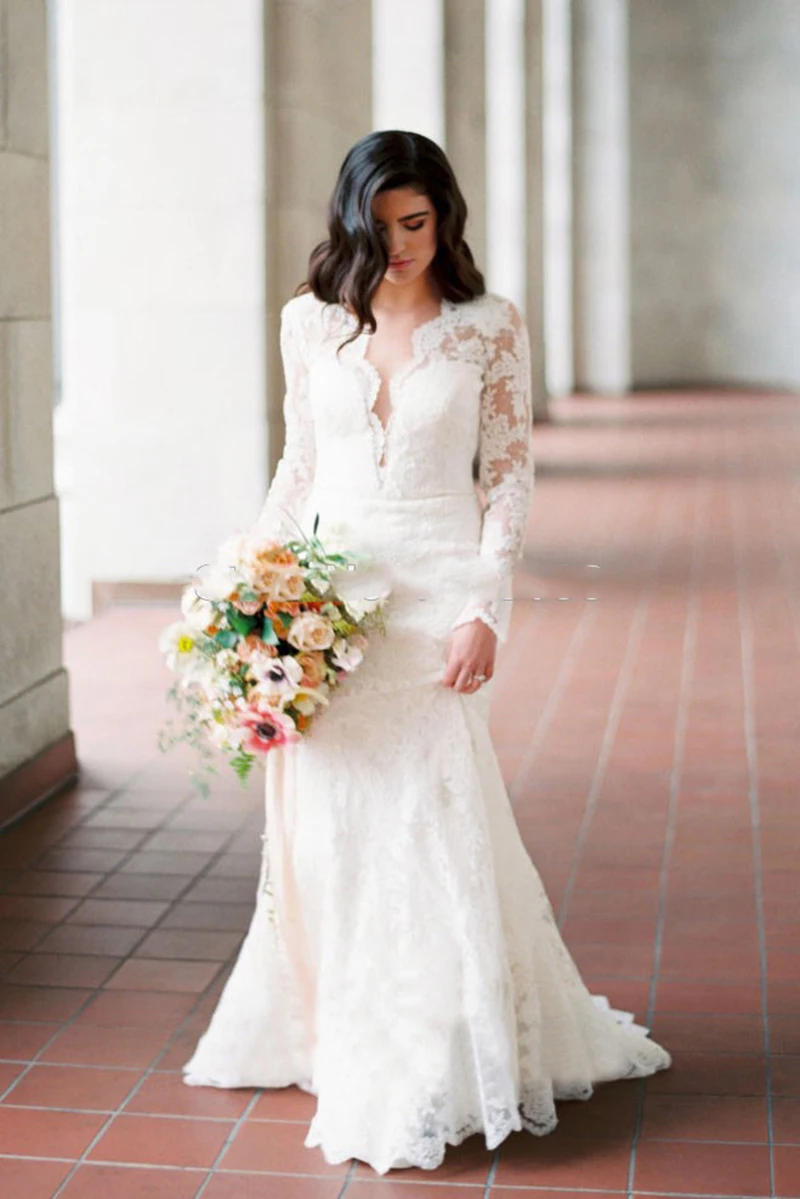 Элегантное свадебное платье-русалка, Кружевная аппликация, Глубокий V-образный вырез, длинные рукава, женское свадебное платье со шлейфом и аппликацией