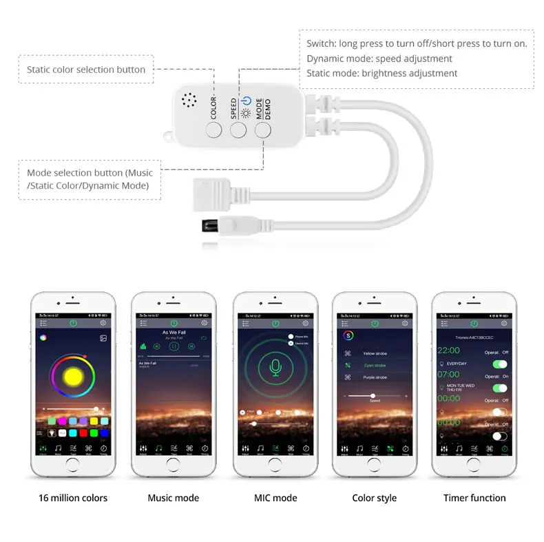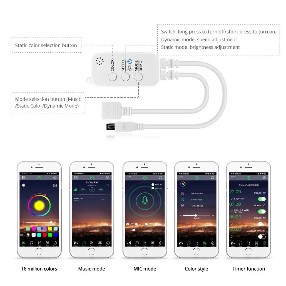 【APP Управление & микрофоном режима】 Управление верескового цвета, светодиодный светодиодные полосы света через приложение, дистанционный пульт Управление и Управление;. С помощью приложения вы можете свободно контролировать 16 миллионов цветов. Светильник с полоской bluetooth имеет умный музыкальный режим, встроенный микрофон с регулируемой чувствительностью, который создает романтику, релаксацию, вечерние атмосферу с музыкой, светильник s изменится с помощью музыки beats или микрофона.【Светодиодная лента с регулируемой яркостью s】этот набор светодиодных лент RGB имеет 300 Премиум 5050 SMD светодиодов с регулятором яркости и яркости. Можно выбрать 28 динамических режимов, таких как мигание, дыхание, стробоскоп, градиент, прохлада и т. д. Вы также можете сделать свой уникальный цвет, я думаю, что это сделает ваши вечерние более потрясающими. С помощью двухслойной меди на печатной плате, чтобы сохранить смешанные цвета более ровными.【 Удобный для пользователя 】 светодиодный фонарик для синхронизации музыки имеет функцию памяти. Когда полоски снова используются, они запоминают последние настройки режима без необходимости повторять настройки. Экологичность, экономия денег и отсутствие излучения. Его можно разрезать между каждые 3 бусинами, так что вы можете настроить их до нужной длины.【Доступно несколько сцен 】 он используется для украшения вашей столовой, спальни, наверху, кухни, веранды, компьютерного стола, рождественской елки, бара и гостиных, особенно отлично подходит для праздников и мероприятий, таких как Рождество, Хэллоуин, вечеринки и многое другое. Это идеальный подарок для вашей семьи и друзей.【Настройка времени: 24 часа/7 дней настраиваемая функция синхронизации позволяет выбрать, когда и в какие дни вы хотите включить/выключить светильник. Вы никогда не будете беспокоиться о том, что в том случае, если вы забыли выключить светильник или нет, установить время для вашей веревки светильник s в тех случаях, когда вы просыпаетесь утром, чтобы светильник вашего прекрасного дня.【Легкость installation】Fully оснащен аксессуары, он поставляется с 1 Катушка 5 м/10 м/15 м светодиодный светильник полосы AC Мощность адаптер, 24-кнопочный ИК-пульт дистанционного управления Управление, нет необходимости в других дорогих устройствах. Простота установки, просто очистите клейкую поверхность и Наклейте, никаких дополнительных шагов. Наше приложение продолжает обновляться, чтобы сделать его совместимым с более умными устройствами. (Поддерживает IOS 8,0 или выше/Android 4,3 или выше)