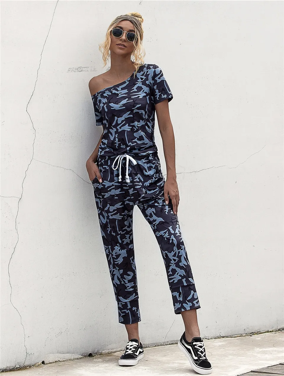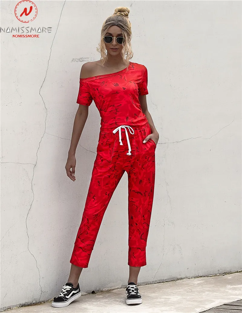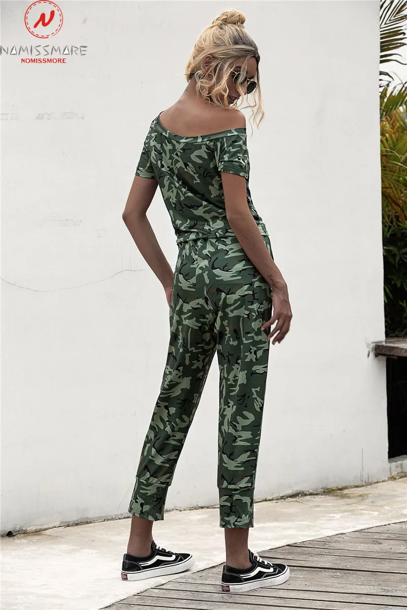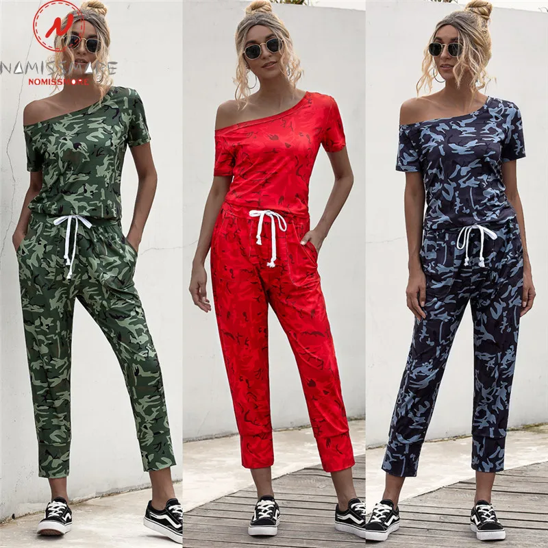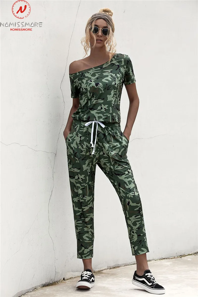Женские Летние повседневные спортивные Комбинезоны на шнуровке, дизайнерские облегающие комбинезоны с карманами и открытыми плечами со средней талией и камуфляжным принтом