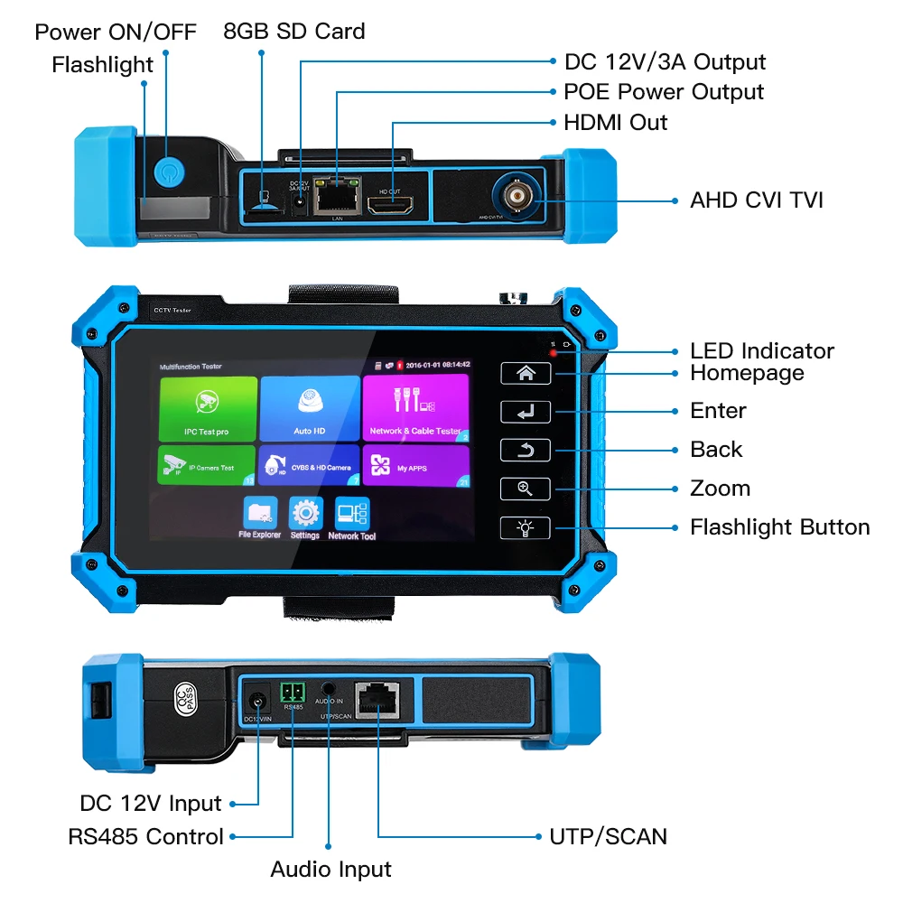 5 дюймов IPS сенсорный экран, 1920x1080. 8MP CVI/TVI/AHD Тест камеры. H.265/H.264, 4K видео-дисплей через основной спектр. HD-выход, поддержка 4K 30FPS. 12 В постоянного тока, 3 А, 48 В, выходная мощность PoE. Быстро ONVIF, создайте отчет об испытаниях, Измените IP-адрес и т. д. Авто HD, автоматическое распознавание типа и разрешения HD коаксиальной камеры. Тест кабеля RJ45 TDR, тест качества кабеля. Тест кабеля UTP, обнаружение ближней, средней и дальней точки неисправности сетевого кабеля, кристальная головка. Встроенный Wi-Fi, отображение изображения с беспроводной камеры, создание точки доступа Wi-Fi.