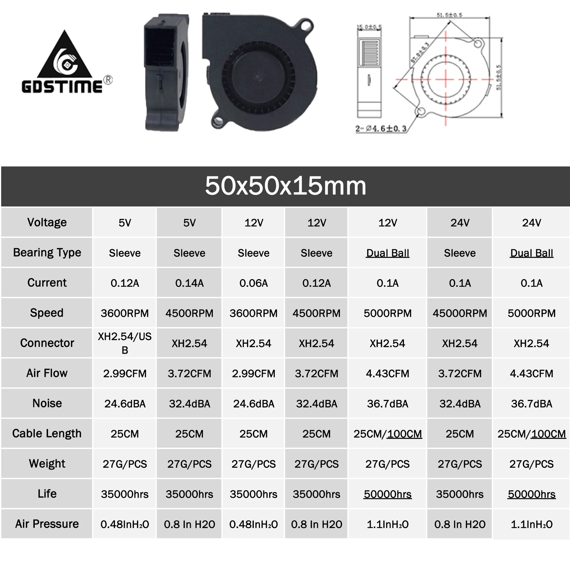 Gdstime 50 мм 5015 вентилятор постоянного тока 5 в 12 В 24 В для деталей 3D принтера центробежные вентиляторы охлаждения 50x50x15 мм турбоохладитель 2Pin USB