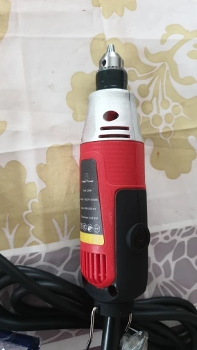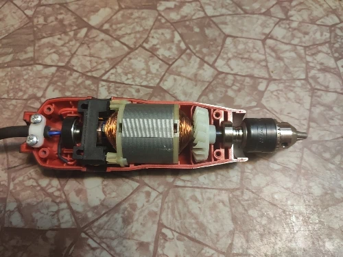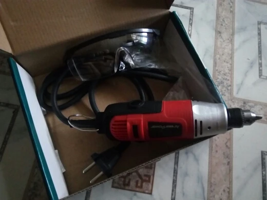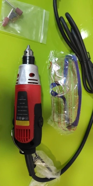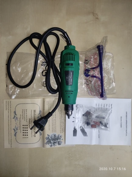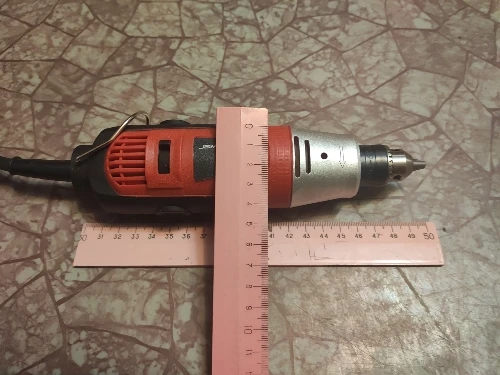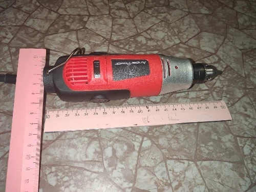 Доставка 66 дней. Минимальный комплект. Прежде чем включить разобрал посмотреть на качество сборки и наличия посторонних предметов ,мусора(внутри чисто ,на фото).Корпус цельный полностью из пластика, голова окрашена серебрянкой. Размер дремеля на фото.