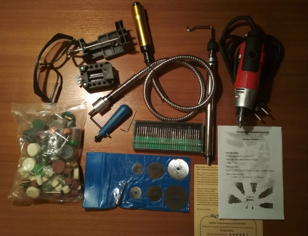 Доставка долгая. Брал вариант с металлическим гибким валом (желтая ручка). Что стоит брать: - машинку, кейс путевый, очки к месту, гибкий вал (хорошо подумать). Все насадки не серьезные (придется перезаказывать путевый набор), стойка раздвижная с креплением к столу - вообще не для этого прибора (струбцина напечатана на 3D принтере и при зажатии легко разгибается), сама вешалка для дремеля от вибрации складывается, крутится и вообще гавно! Гибкий вал - брал металлический, из расчета что надежней будет - но первое включение показала недоработки явные - во первых корпус вала никак не закрепляется на корпус дремеля из-за чего при вращение вала - прокручивается и корпус вала потому что никак не зафиксирован, во-вторых шумит, удары внутри гибкого вала - работать не комфортно! Доводить самому придется. Дремель все как и в других отзывах - работает, греется, без биений - машинку рекомендую к покупки, все остальное решать вам.