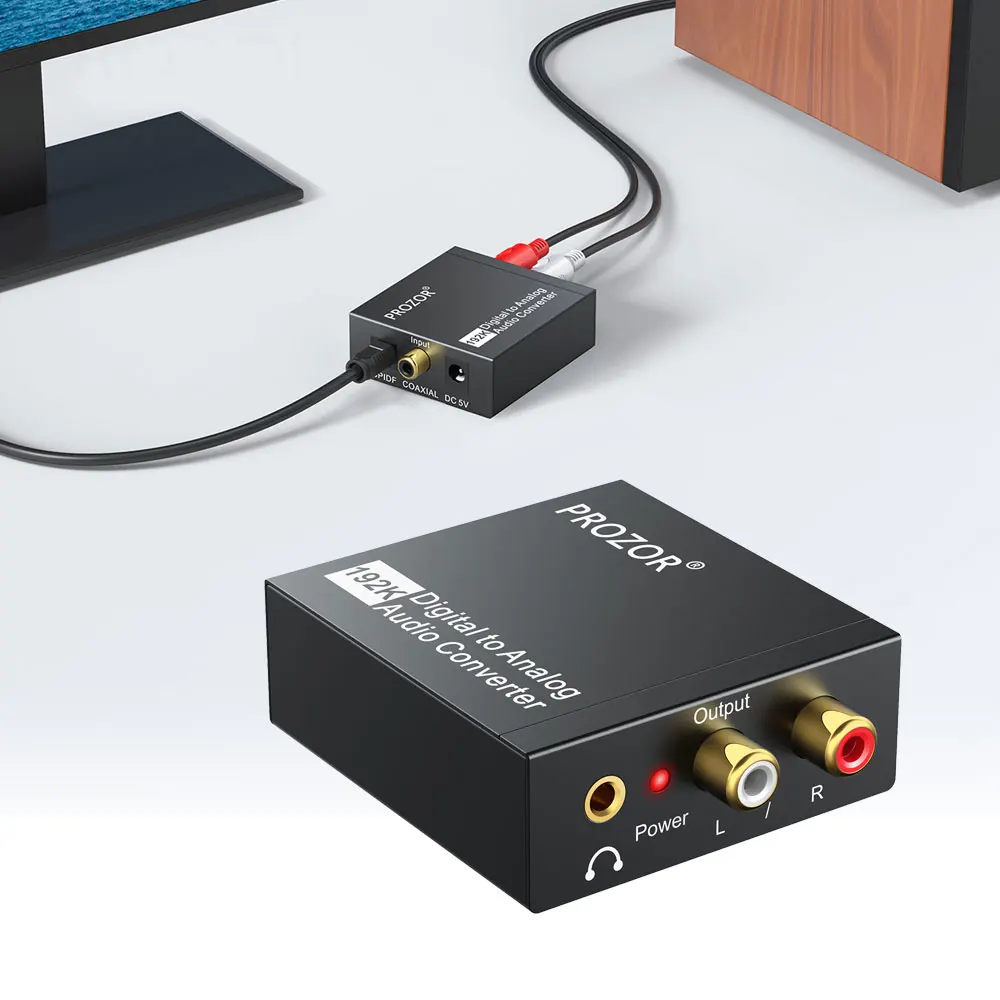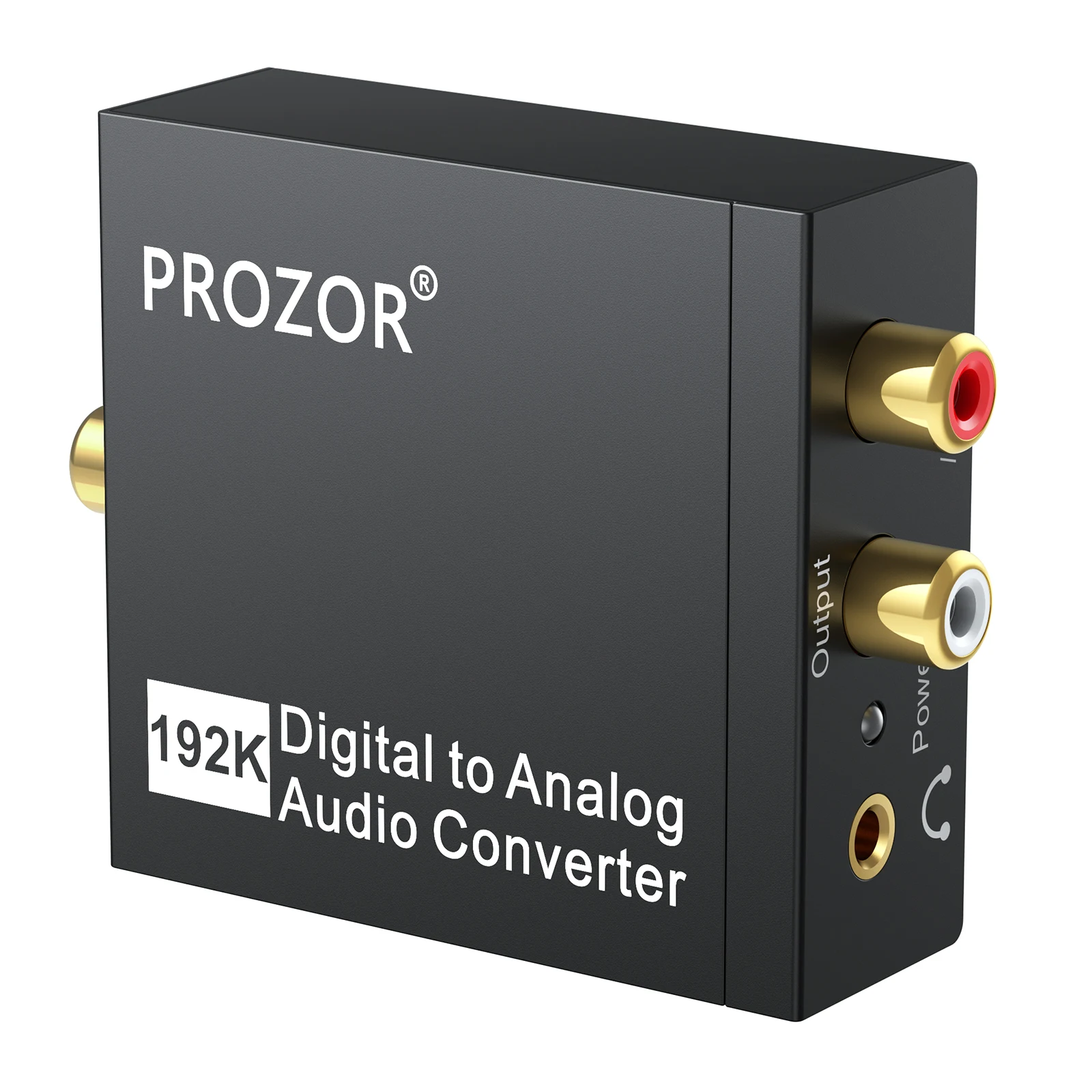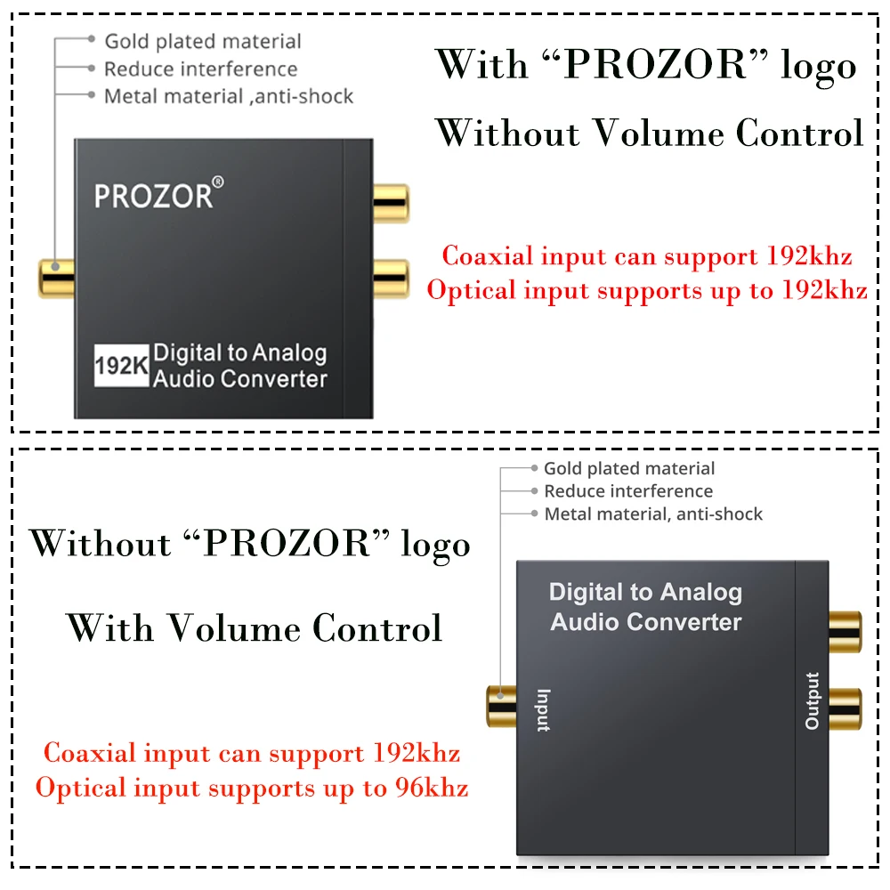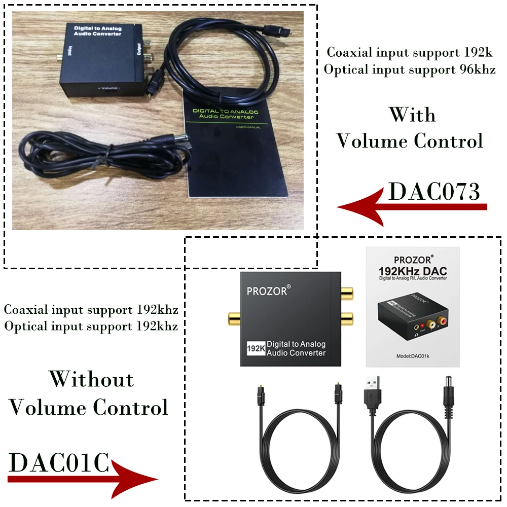 DAC073: с регулятором громкости, но без логотипа "PROZOR" + коаксиальный оптический вход может поддерживать 192k, Оптический вход поддерживает до 96 кГцВведение:Этот цифро-аналоговый аудио конвертер предназначен для домашнего или профессионального аудио переключения. Он Преобразует коаксиальный или Toslink цифровой звуковой сигнал в аналоговый L/R аудио и доступен для подключения к внешнему устройству, например, усилителю через стандартные разъемы типа RCA. Этот конвертер небольшого размера и довольно прост в установке. Также к нему добавляется функция регулировки громкости.Особенности:1. Преобразует коаксиальный или Toslink цифровой звуковой сигнал в аналоговый L/R аудио2. Поддерживает частоту дискретизации 32, 44,1, 48, 96 и 192 кГц.3. 24-битный SPDIF входящий бит потока на левый и правый каналы4. Обеспечивает передачу без электромагнитного шума.5. Легко устанавливается и прост в эксплуатации.6. С функцией регулировки громкости.Спецификация:Поддержка аудио формата: PCMСоотношение сигнал/шум: 105 дБСтепень разделения (1 кГц): 94 дБTHD + N: -90 дБОбщее гармоническое искажение (THD): 10 Гц ~ 20 кГц 0,25-0.065%Время блокировки: 0.577FsЧастота дискретизации: 32 ~ 192 кГцБитрейт: 16 ~ 24 битВходной электрический уровень: ± 0,3 вВыходной Электрический уровень: 3 вМаксимальная выходная мощность: 0,3 ВтВыходная мощность наушников: 0-250 мВтВыходное сопротивление: 10 ОмРабочее напряжение: + 5 ВРазмер: 72x55x20 ммВес (нетто): 78 гПожалуйста, обратите внимание:1. Установите аудиовыход телевизора в формат PCM/LPCM.2. Этот конвертер не поддерживает 5,1 каналов, таких как Dolby и DTS.3. PS4 Pro и PS4 Slim не могут использовать этот конвертер, так как у них нет интерфейса вывода оптического волокна.4. Для телевизора Samsung, если нет звука, даже вы установите аудиовыход в формат PCM/LPCM, включите внешние динамики телевизора (меню-звук-Настройка динамика-HESB/внешний динамик-ВКЛ.)Содержимое упаковки:1 х цифро-аналоговый аудио конвертер1x1 м Toslink кабель (оптический кабель)USB кабель (1 шт.);Руководство пользователя (1 шт.)