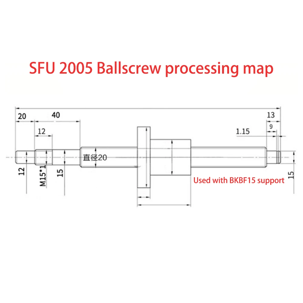 Точность: класс C7 Диаметр: 20 мм; Шаг: 5 мм; Цвет: Серебристый; Длина: 200 мм-1000 мм (общая длина, включая часть торцевой обработки) Упаковочный лист: 1 X SFU2005 шариковый винт 1 х шариковая гайка 1 комплект BK15/BF15 Торцевая поддержка Корпус шаровой гайки-1 шт.