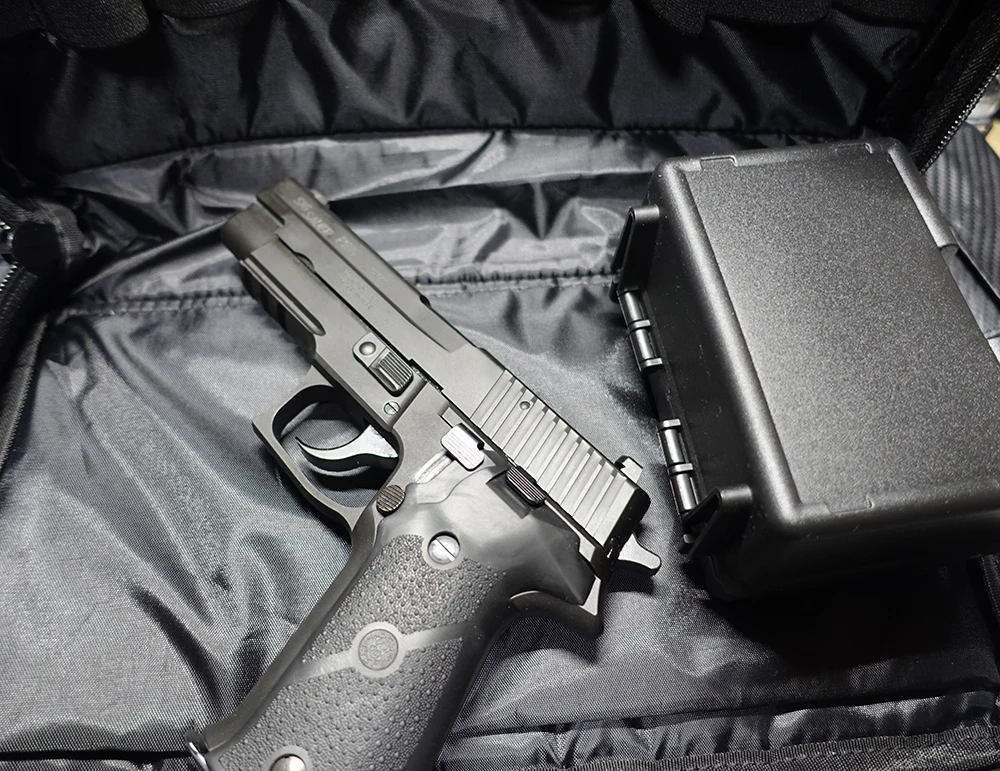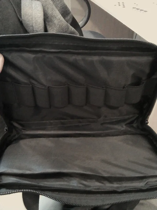 Эта сумка может подходить любому обычному пистолету полного размера, а также имеет 7 держателей для журналов и дополнительное пространство для патронов, если вы хотите носить с собой. Также небольшая молния снаружи для наушников.