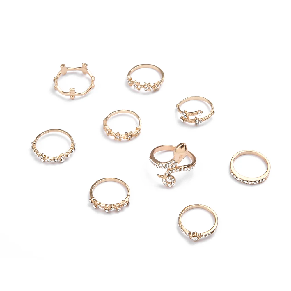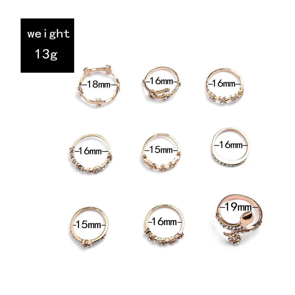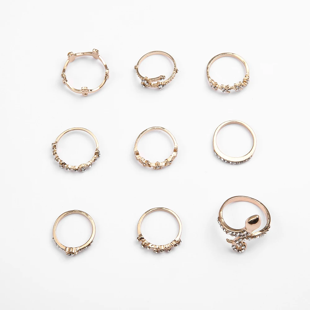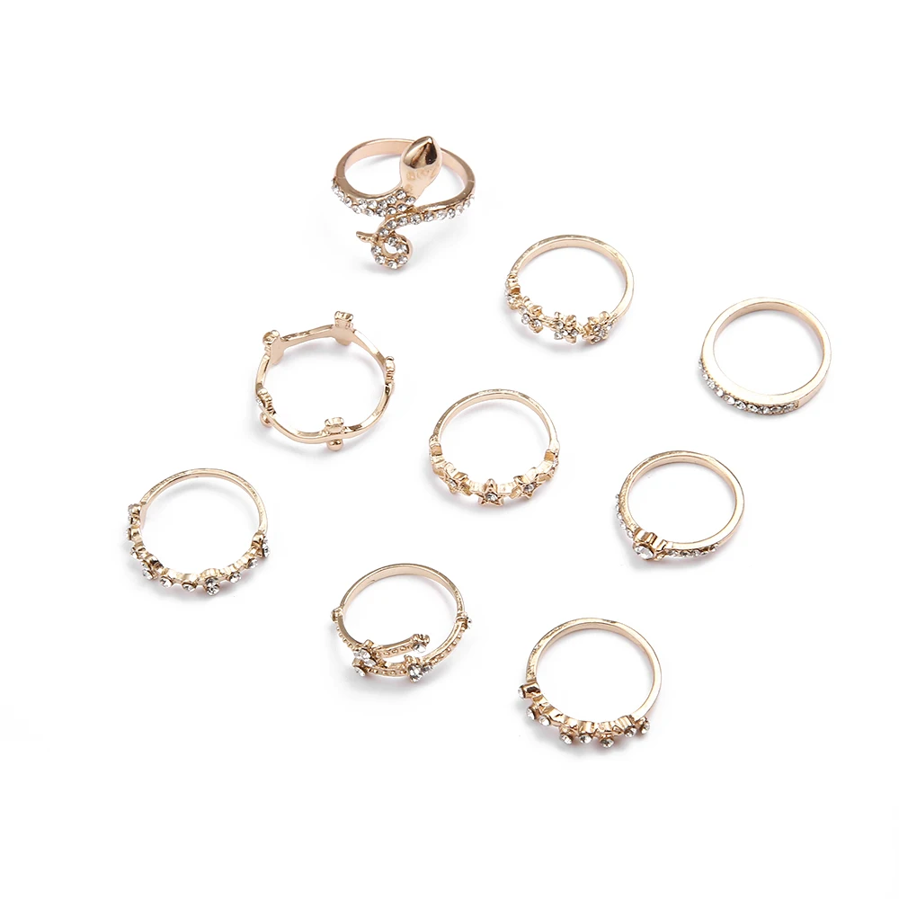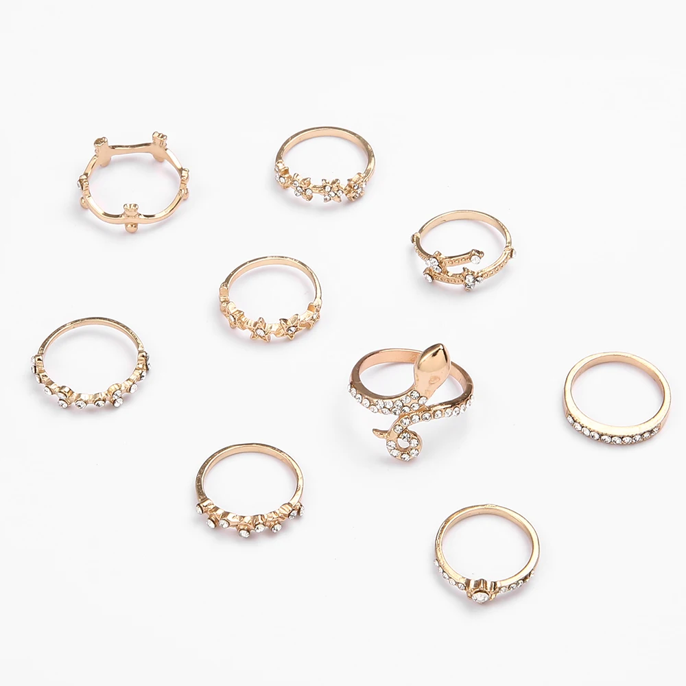 Кольцо женское, 9 шт.компл., в богемном стиле, с золотыми кристаллами, в форме змеи, сердца, цветка