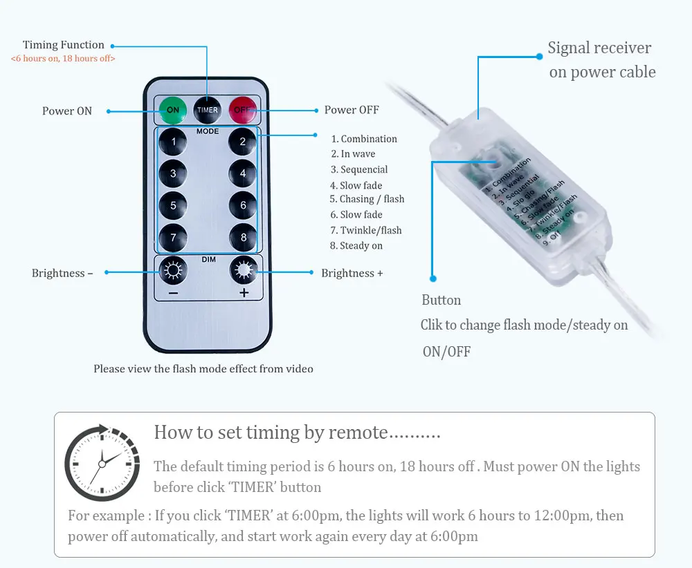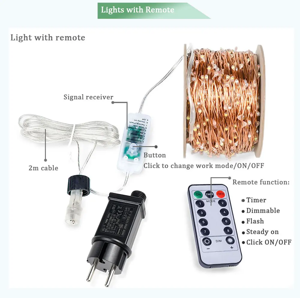 ПараметрыСостояние на 100% абсолютно новыйКоличество СВЕТОДИОДНЫЙ: 100- 1000 светодиодный s/гирляндаДлина: 10 м 20 м 30 м 50 м 100 мЦвет: теплый белый, холодный белый, разноцветный светильникЦвет провода: зеленый, медный, серебристыйВодонепроницаемость: струны являются водонепроницаемыми и могут использоваться на открытом воздухе, Адаптер должен продолжать пробоватьТип вилки: ЕС, США, Великобритания, Австралия, пожалуйста, оставьте сообщение, какой разъем вы используетеВходное напряжение: AC100-240V, может использоваться для 110 В и 220 В страныВыходное напряжение: 10 м, 20 м 5 В; 30 м 12 В; 50 м 15 В; 100 м DC30VРежим работы: Нет дистанционного освещения только Стабильный режим включенияПодсветка с пультом ДУ имеет 8 режимов: 7 вспышек + постоянное включениеПосылка:Пульт дистанционного управления: 1 гирлянда + 1 адаптерС пультом дистанционного управления: 1 гирлянда с контроллером + 1 адаптер + 1 пульт дистанционного управления