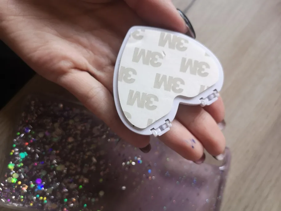 Viene dividido y tienes que pegar el corazón en la parte que a ti te guste. Viene con el pegamento incorporado.