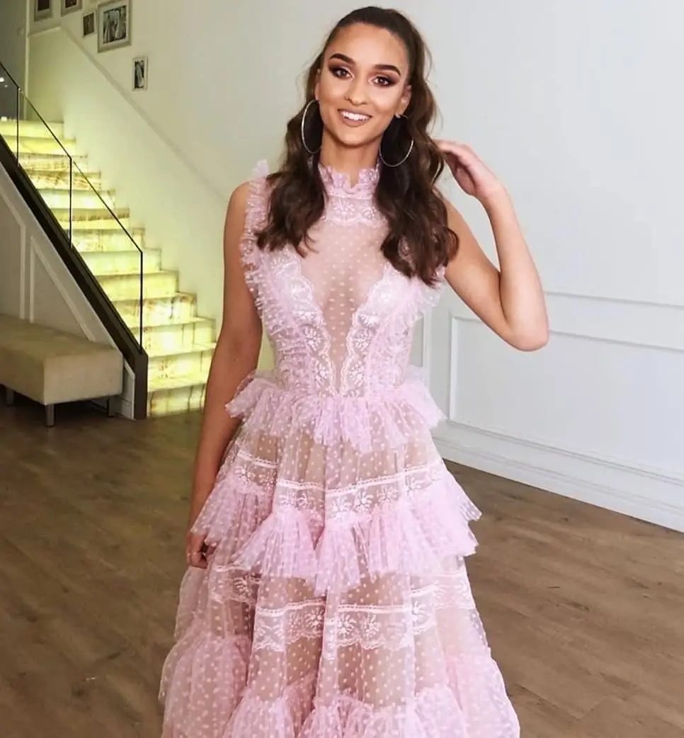 Длинное розовое Тюлевое платье, с высоким воротом и многоярусной юбкой, для выпускного вечера
