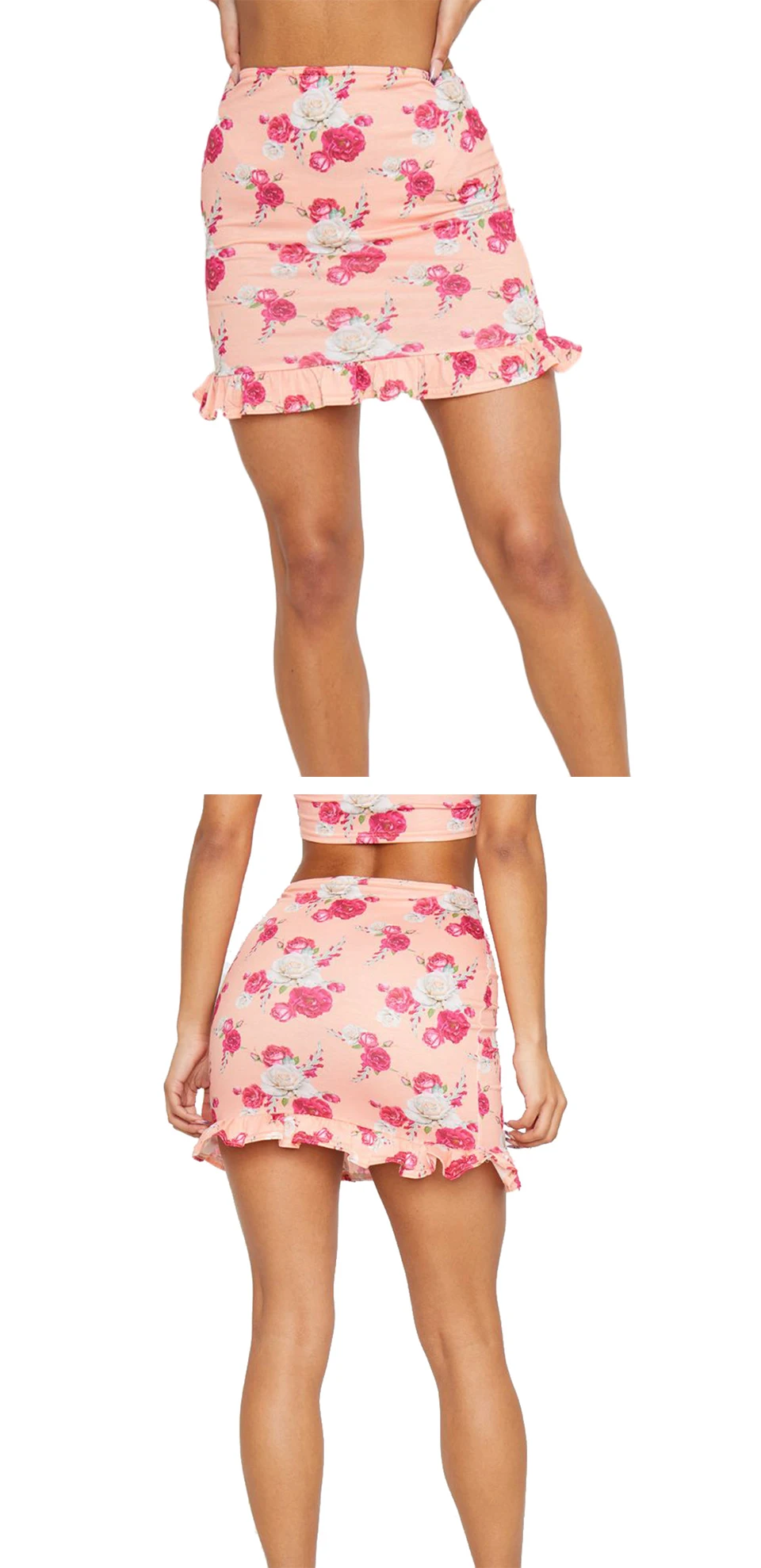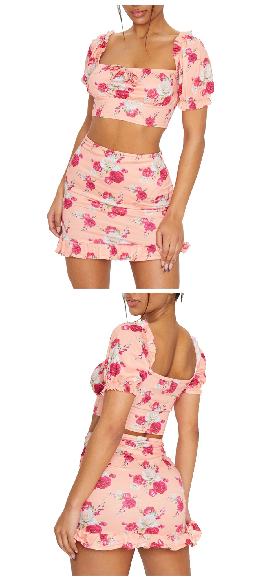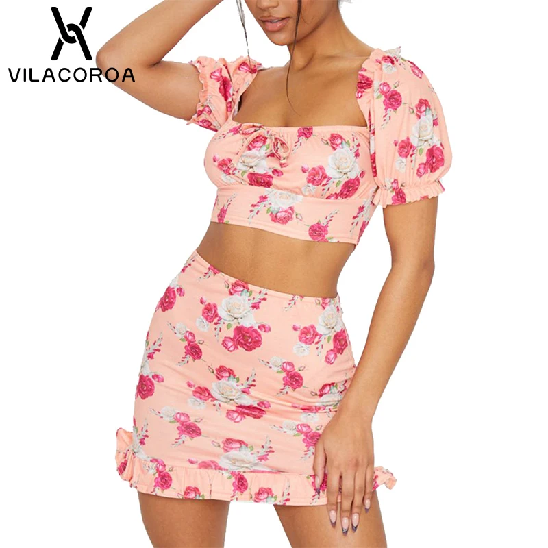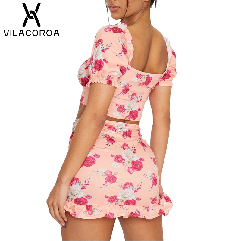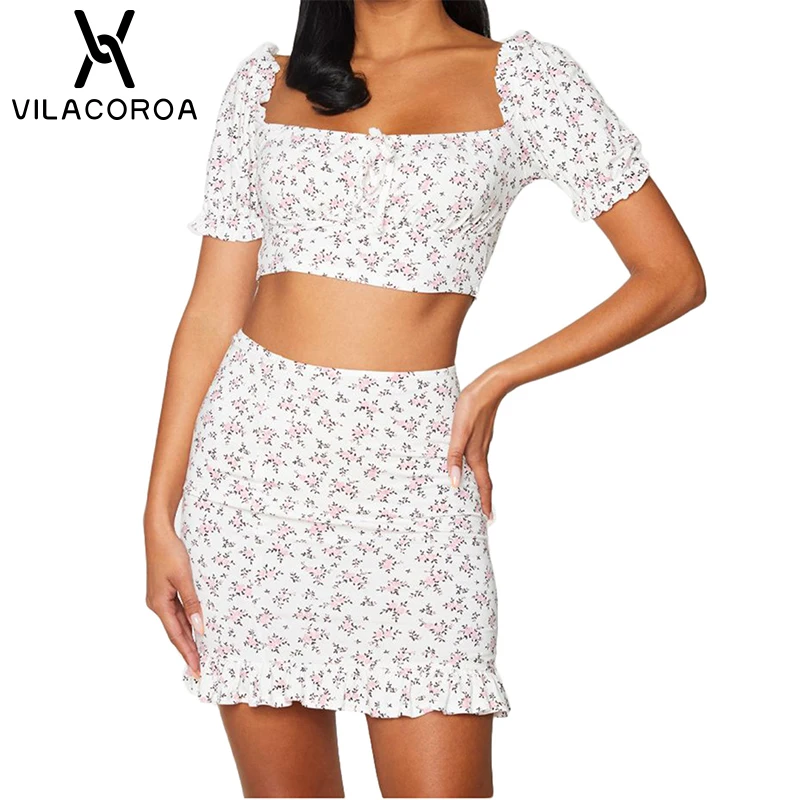 Женский комплект из 2 предметов, уличный комплект с принтом, короткий топ с квадратным вырезом, рукавами-баллонами, на шнуровке, юбка с оборками и высокой талией, костюм с открытой спиной