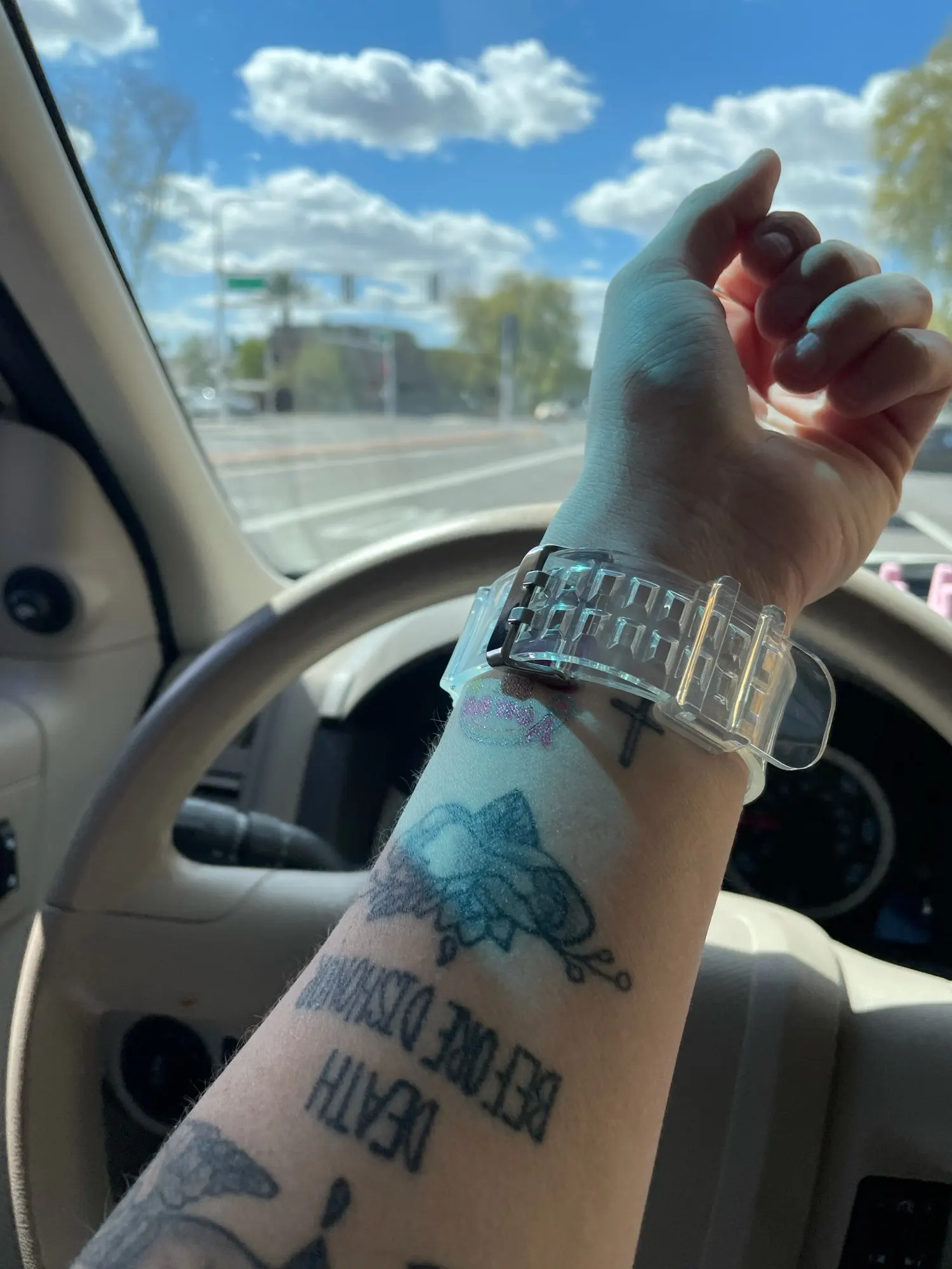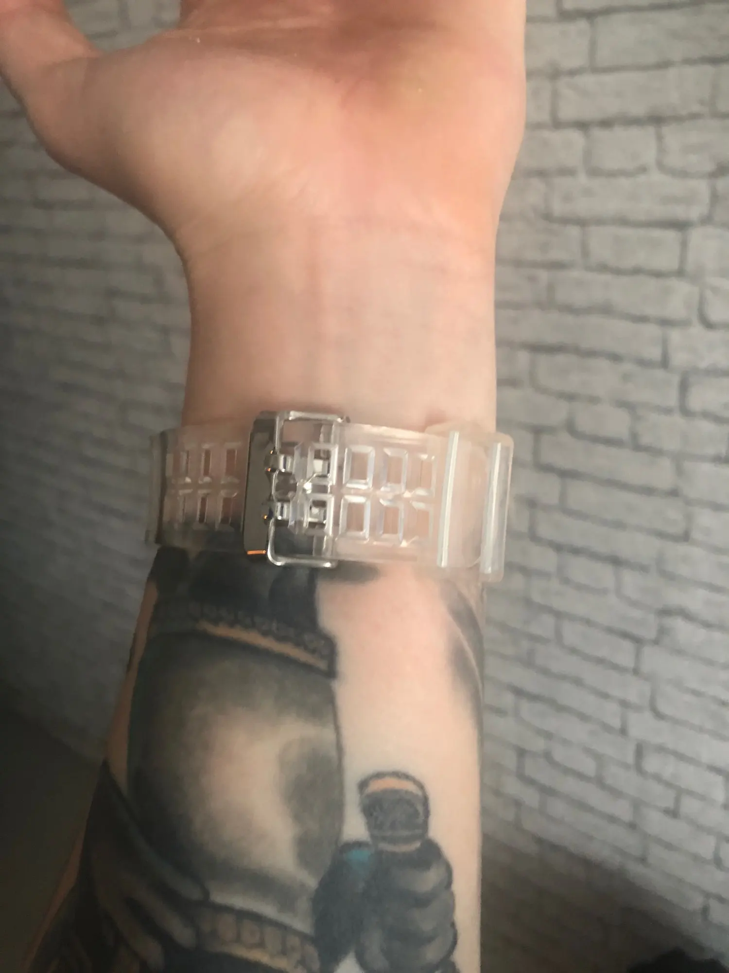 Выглядит как на рисунке,я довольна,но надо было подумать перед тем как заказывать прозрачный ремешок-ибо думаю он у меня скоро станет непрозрачным