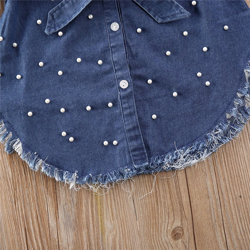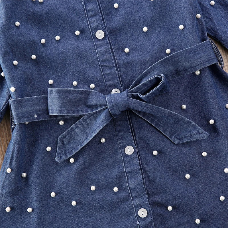 2020 модное платье для маленьких девочек однобортное джинсовое платье с длинными рукавами и поясом с жемчужинами весна-осень
