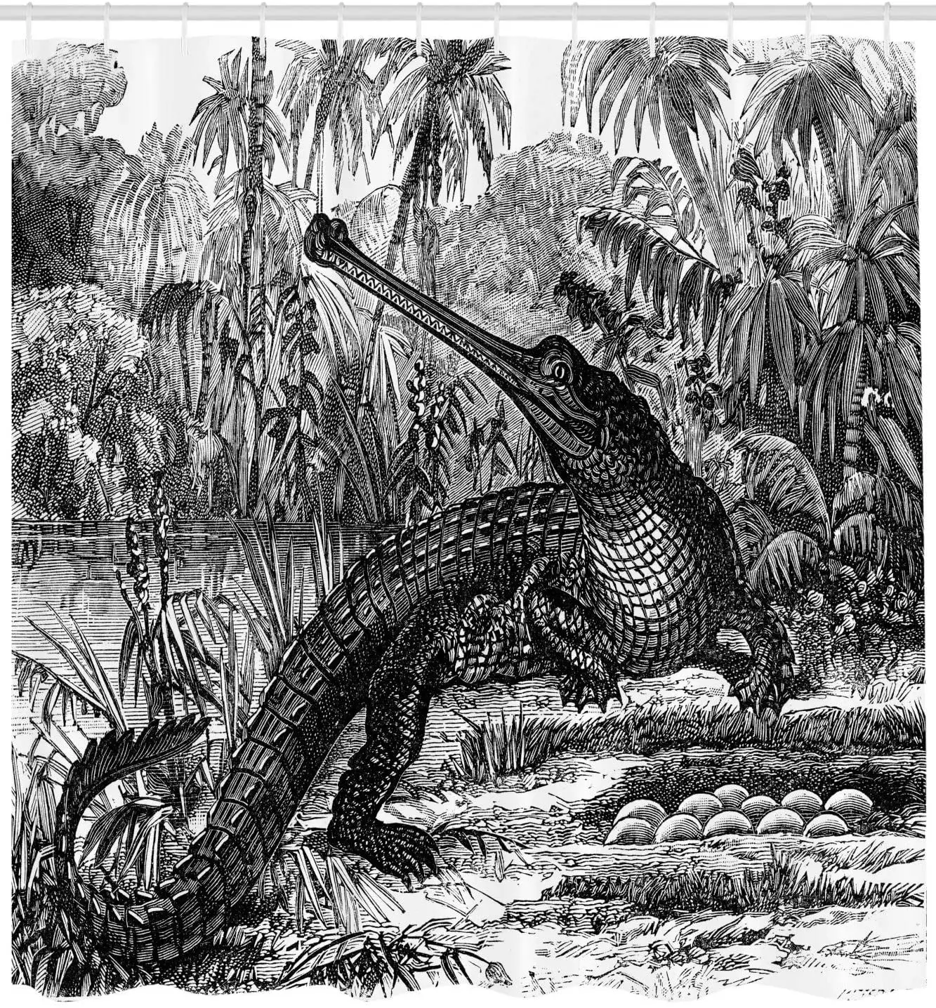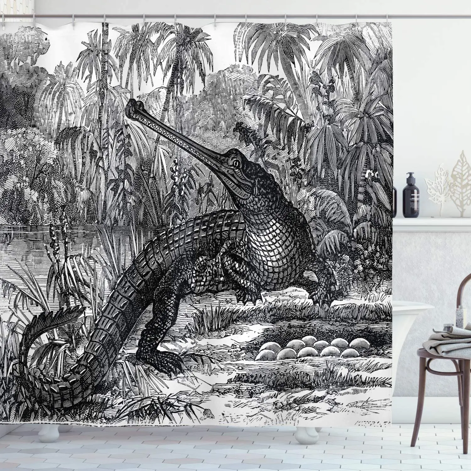 Винтажная занавеска для душа, старое модное изображение крокодила в лесу, дикой природы, природы, леса, ископаемое изображение, набор для декора ванной комнаты