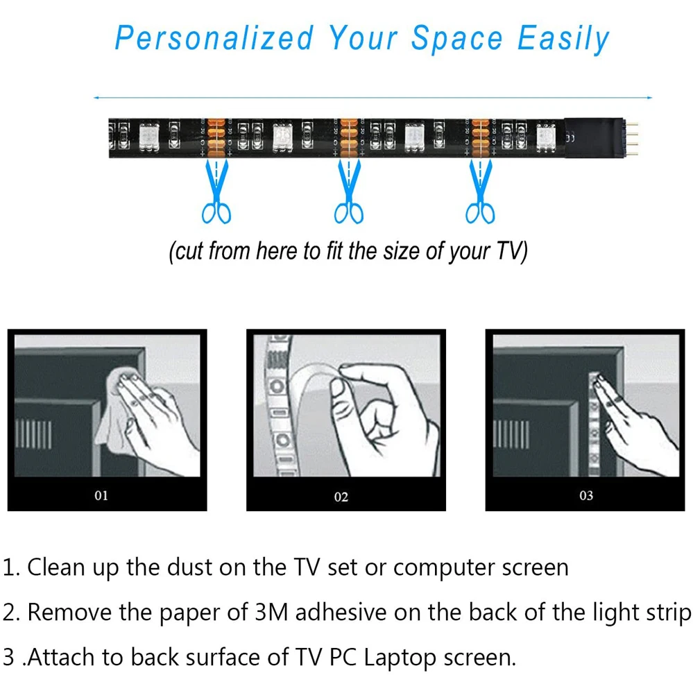 【Безопасная и простая установка 】 питание от USB 5 В, низкое тепло и безопасность на ощупь. Самоклеящаяся Задняя лента, просто установите ленточный светильник RGB, снимая заднюю крышку и наклеивая на желаемую область установки.