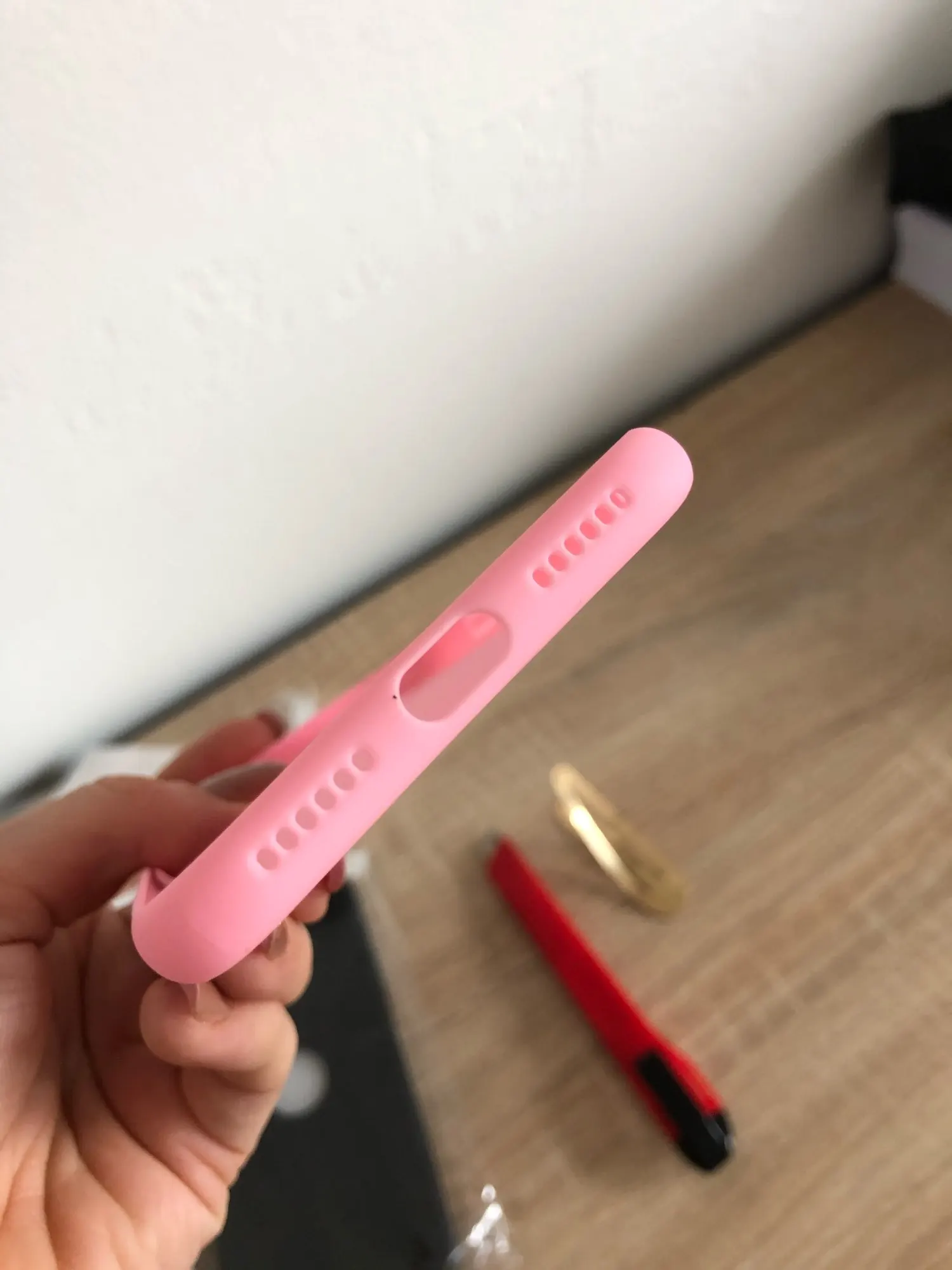 Быстрая доставка. Описанию соответствует. Отверстия совпадают. Цвет больше алый, чем красный. В руке ощущение ближе к пластику, чем силикон. Если есть защитное стекло, то бортики чехла будут чуть ниже.