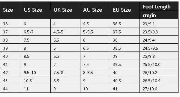 Таблица размеров Размер::36 Размер США::6 Размер Великобритании::4 Размер AU::4,5 Размер ЕС::36,5 Длина стопы (см/дюйм)::1/23/9 Размер::37 Размер США::6,5-7 Размер Великобритании::4,5-5 Размер AU::5-5,5 Размер ЕС::37,5 Длина стопы (см/дюйм)::23,5/9,3 Размер::38 Размер США::7,5 Размер Великобритании::5,5 Размер AU::6 Размер ЕС::38 Длина стопы (см/дюйм)::1/24/9 Размер::39 Размер США::8 Размер Великобритании::6 Размер AU::6,5 Размер ЕС::38,5 Длина стопы (см/дюйм)::24,5/9,6 Размер::40 Размер США::8,5 Размер Великобритании::6,5 Размер AU::7 Размер ЕС::39 Длина стопы (см/дюйм)::1/25/9 Размер::41 Размер США::9 Размер Великобритании::7 Размер AU::7,5 Размер ЕС::39,5 Длина стопы (см/дюйм)::25,5/10 Размер::42 Размер США::9,5-10 Размер Великобритании::7,5-8 Размер AU::8-8,5 Размер ЕС::40 Длина стопы (см/дюйм)::1/26/10 Размер::43 Размер США::10,5 Размер Великобритании::8,5 Размер AU::9 Размер ЕС::40,5 Длина стопы (см/дюйм)::26,5/10,4 Размер::44 Размер США::11 Размер Великобритании::9 Размер AU::10 Размер ЕС::41 Длина стопы (см/дюйм)::1/27/10