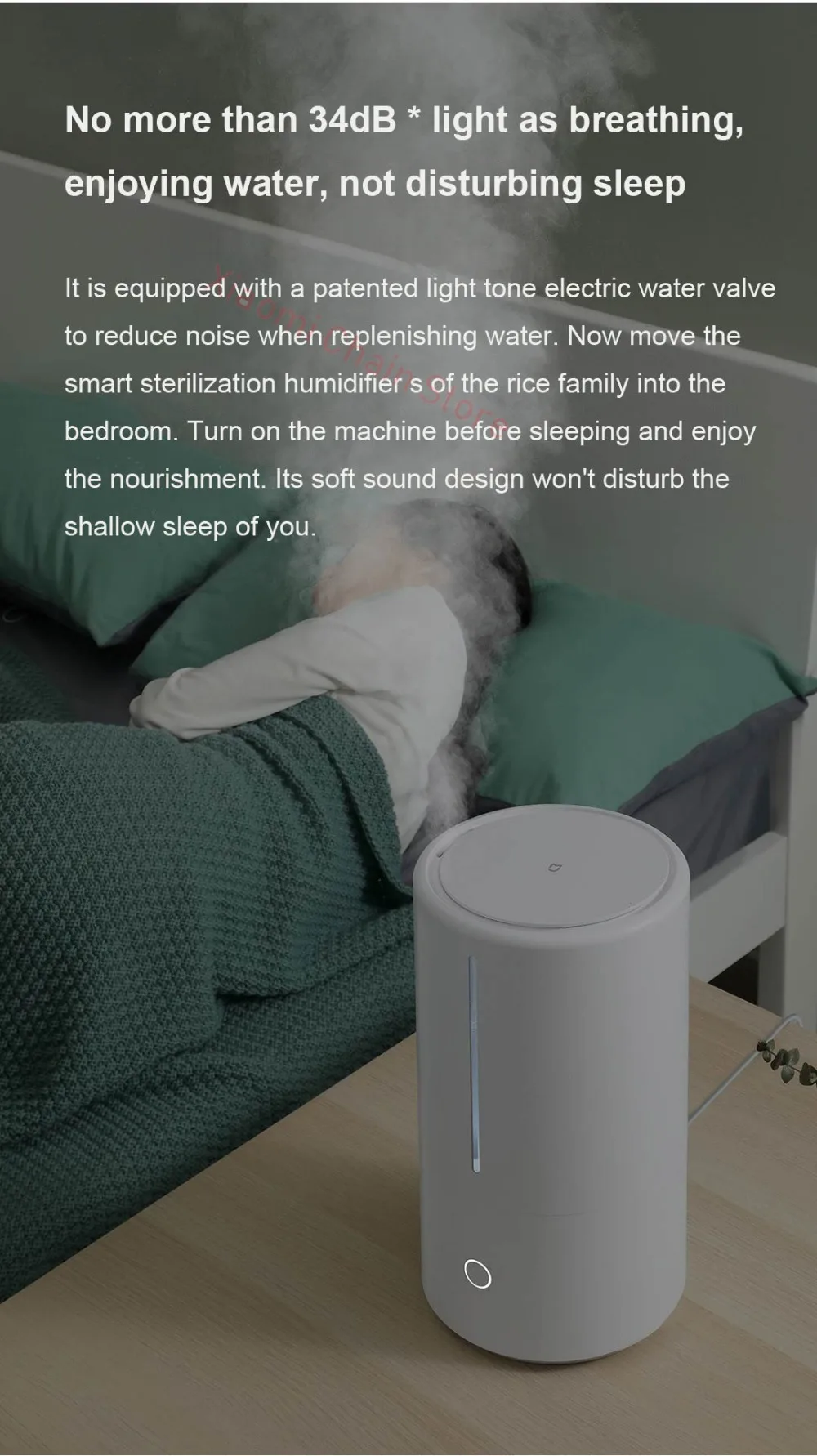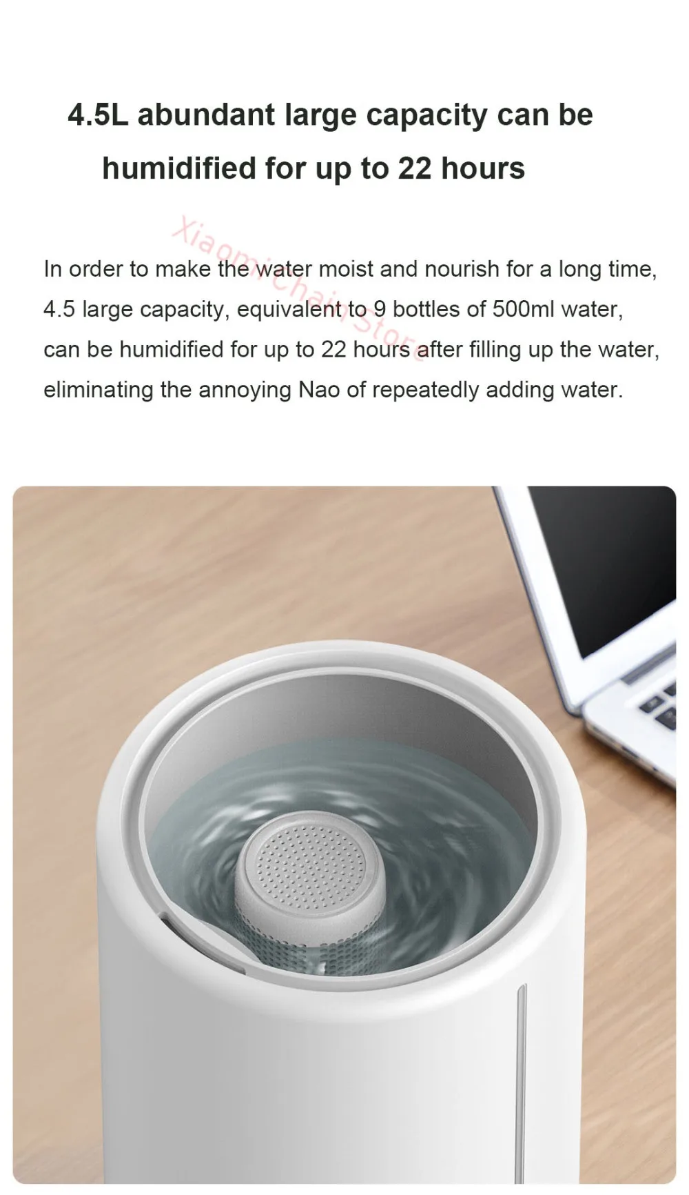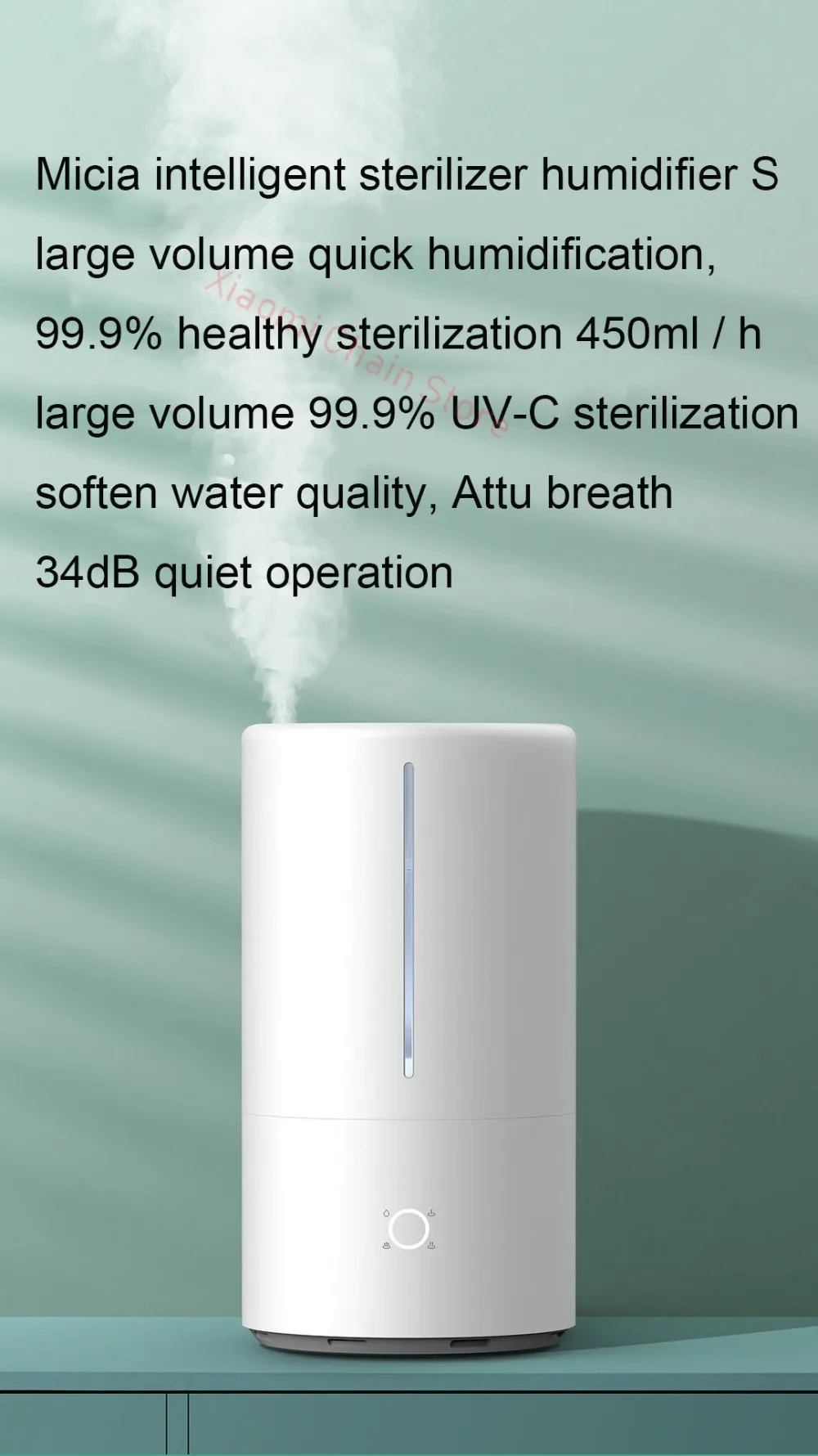 Тяжелый туман быстро увлажняет, 99.9% здоровая стерилизация * 450 мл/ч объем тумана * 99.9% UV-C стерилизация * смягчение воды для ухода за дыханием * 34 дБ тихая работа