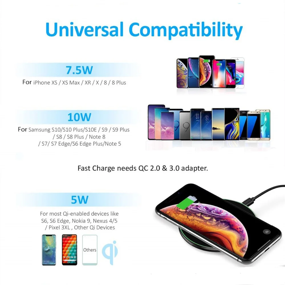 10 Вт Qi Беспроводное быстрое зарядное устройство, скорость зарядки до 1,6x быстрее, чем обычное зарядное устройство.Беспроводная зарядка для iPhone xs/ xs max/ xr/iPhone x/ 8/ 8 plus, 7,5 Вт Скорость зарядки;Зарядка для Samsung s10/ s10 plus/ s10e/ s9/ s9 plus/ s8/ s8 plus/ note8 /note 5/ s7/ s7 edge/ s6 edge plus и некоторые другие мобильный телефон, скорость зарядки 10 Вт;Зарядка для обычного телефона, скорость зарядки 5 Вт.