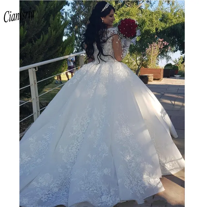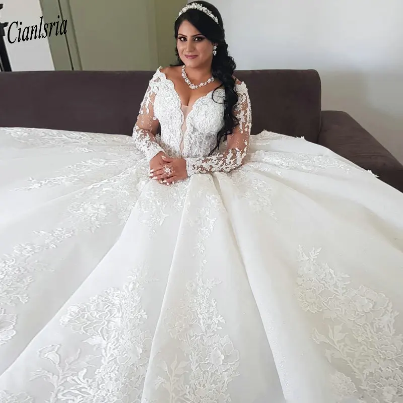Великолепное бальное платье с открытыми плечами и бисером, свадебное платье с V-образным вырезом, кружевное свадебное платье с длинными рукавами Дубая, арабское свадебное платье