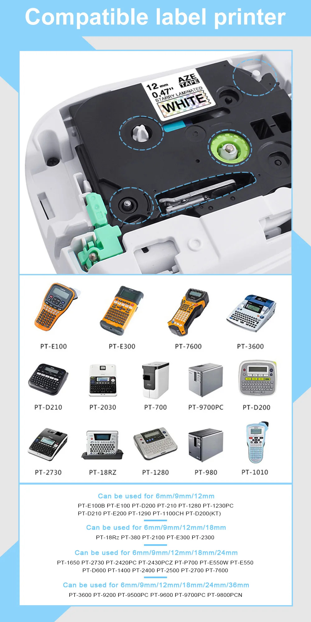 100% Совместимость со следующими принтерами:PT-D210, PT-H100, PT-D400AD, PT-P700, PT-D600, PT-1230PC, PT-1890C, PT-D600VP, PT-P750W, PT-2730VP, PT-D450, PT-D400, PT-D200, PT-1880C, PT-1880, PT-H500LI, PT-2730, PT-1890W, PT-2430PC, PT-9700PC, PT-2300, PT-1280SR, PT-2030AD, PT-1090, PT-1290, PT-1880W, PT-9600, PT-H100, PT-1000BM, PT-1000, PT-1010, PT-1010B, PT-1010NB, PT-1010R, PT-1010RDT, PT-1010S, PT-1090BK, PT-1100, PT-1100QL, PT-1100SB, PT-1100SBVP, PT-1100ST, PT-1120, PT-1130, PT-1160, PT-1170, PT-1170S, PT-1180, PT-1180SC, PT-1180SP, PT-1190, PT-11Q, PT-1200, PT-1280, PT-1280BT, PT-1280SP, PT-1280TG, PT-1280VP, PT-128AF, PT-1290BT2, PT-1290BT, PT-1290RS, PT-1290SBVP, PT-1300, PT-1400, PT-1500, PT-1500PC, PT-1600, PT-1700, PT-1750, PT-1750SC, PT-1800, PT-1810, PT-1830, PT-1830C, PT-1830SC, PT-1830VP, PT-1880CT, PT-1880SC, PT-1890SC, PT-18R, PT-18RKT, PT-1900, PT-1900C, PT-1910, PT-1950, PT-1960, PT-200, PT-2030, PT-2100, PT-2030VP, PT-2110, PT-2200, PT-2210, PT-2310, PT-2400, PT-2410, PT-2470, PT-2500PC, PT-2600, PT-2610, PT-2700, PT-2710, PT-300, PT-300B, PT-310, PT-310B, PT-320, PT-330, PT-340, PT-350, PT-3600, PT-4000, PT-520, PT-530, PT-540, PT-550, PT-580C, PT-6100, PT-7500, PT-7100, PT-9200DX, PT-9200PC, PT-9400, PT-9500PC, PT-9800PCN, PT-D200BT, PT-D200DA, PT-D200MA, PT-D200SA, PT-D210BK, PT-E100, PT-D400VP, PT-E300VP, PT-E300, PT-E500, PT-E500VP, PT-E550W, PT-E550WVP, PT-H105, PT-H110, PT-H300, PT-H300LI, PT-H500LI, PT-P750WVP, PT-P900W, PT-P950NW,ST-1150,ST-1150DX,ST-5,PT-D200G, PT-D800W, PT-E110, PT-H100P, PT-H100R, PT-H110BK,PT-P900etc